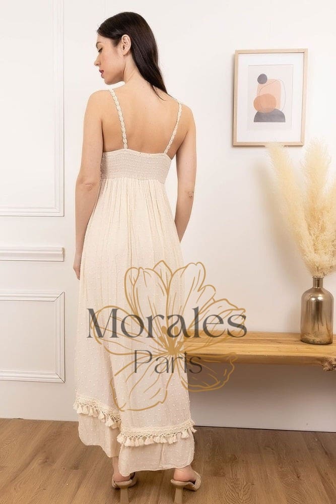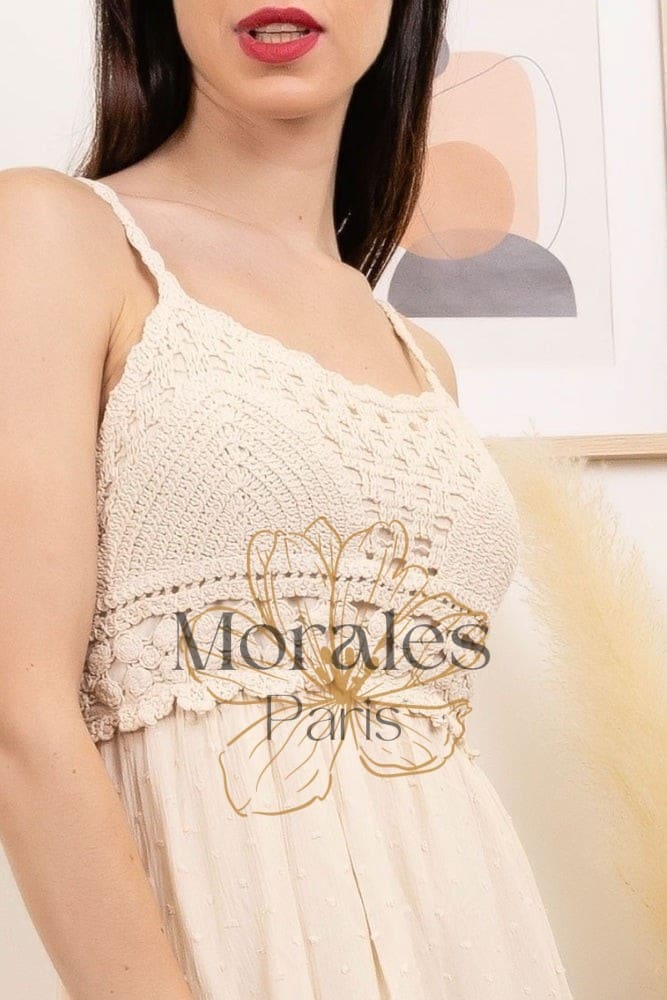 - Détails : dos smocké, crochet, broderie, pois gaufrés, pompons