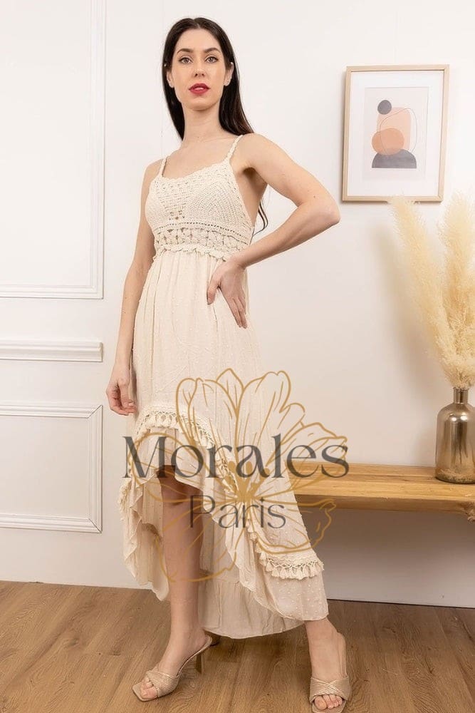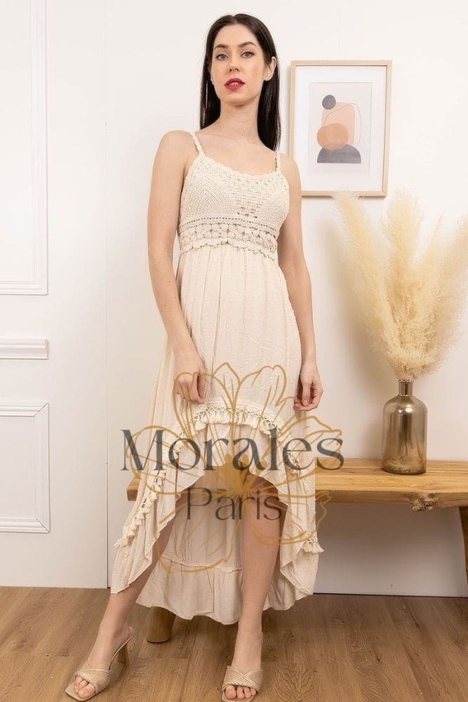 Cet article fait chavirer notre cœur grâce à son habit bohème en crochet asymétrique. Avec son haut en crochet, ses pompons et sa coupe qui dévoile les gambettes, elle nous rend tellement chic. Pas de doute, on peut compter sur elle pour avancer d’un pas de danse. À porter avec des sandales ou des talons. Parfaite pour une tenue d’invitée à un mariage bohème.