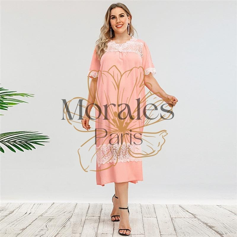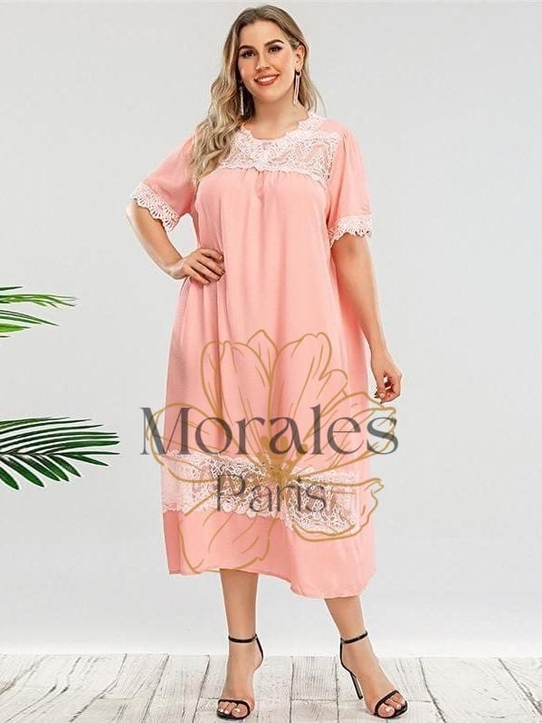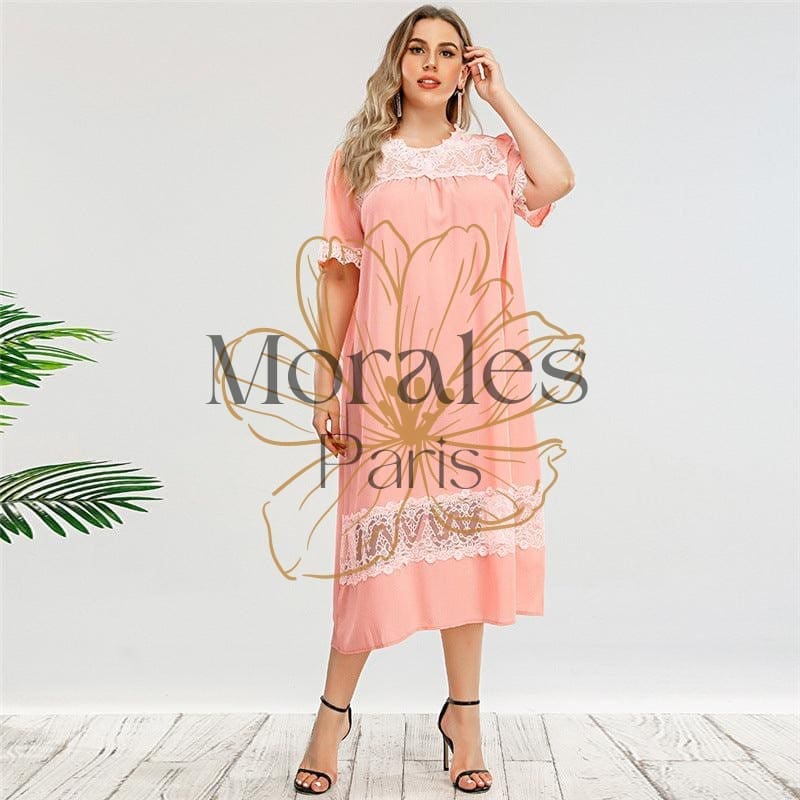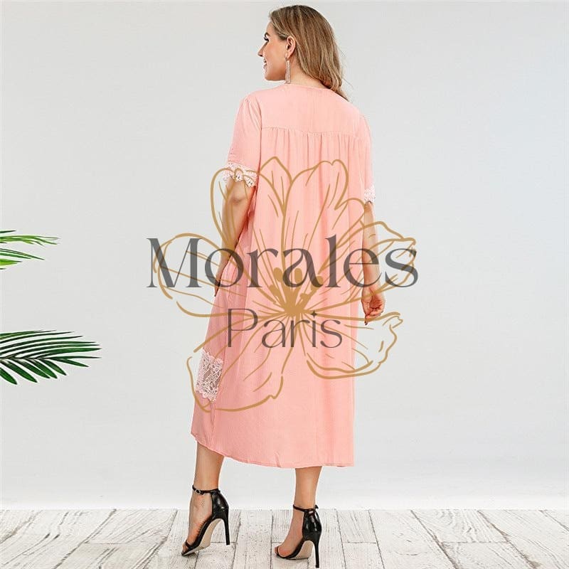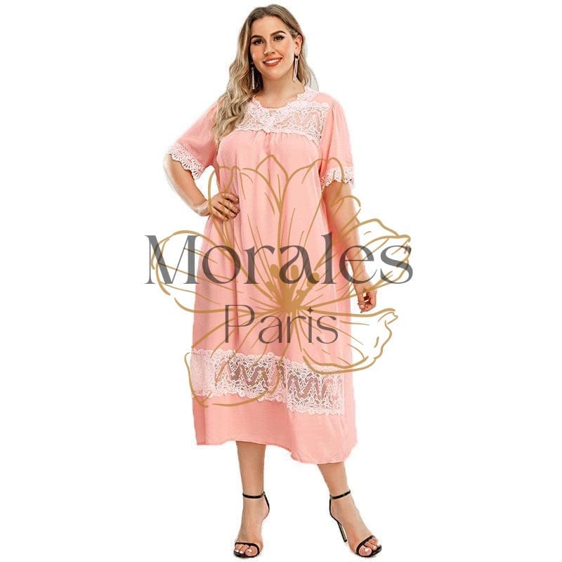 Ayez le coup de cœur pour la robe bohème grande taille ornée de dentelle ! Un vêtement confortable et agréable à porter grâce à son tissu fluide et léger. La couleur rose pastel donne une touche particulièrement féminine à la robe et s’associe à merveille à la jolie et fine dentelle blanche qui orne délicatement le bas des manches 3/4, le bas de la robe ainsi que son encolure.
