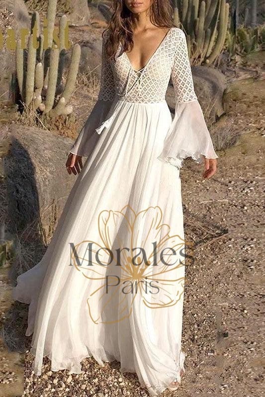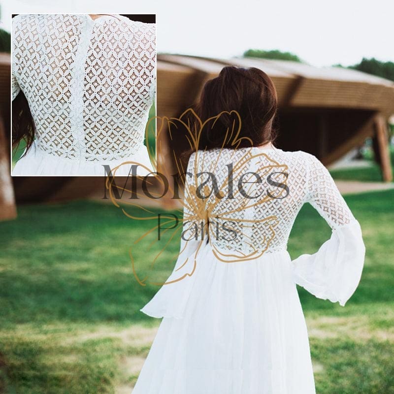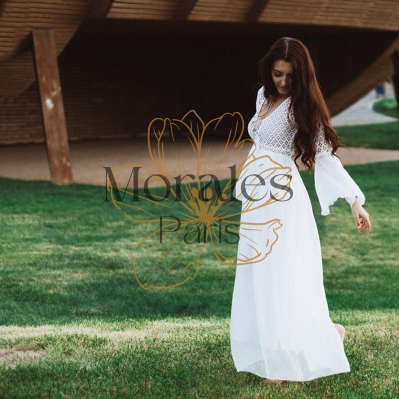 Cette robe longue blanche est un vêtement exclusif avec une couture renforcée pour une plus grande solidité. Sa partie haute est en dentelle très détaillée et la partie basse en mousseline semi-transparente pour une légèreté accrue. Son look Bohême et élégant sera parfait pour l’été, un dîner romantique ou une soirée habillée.
