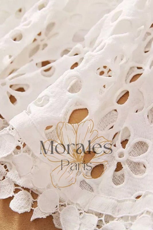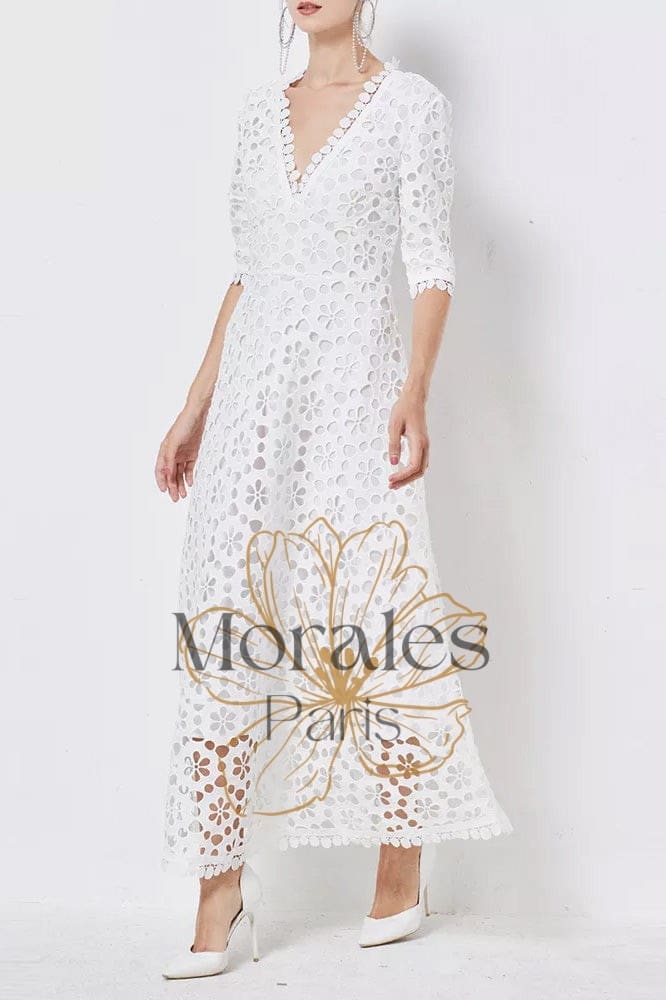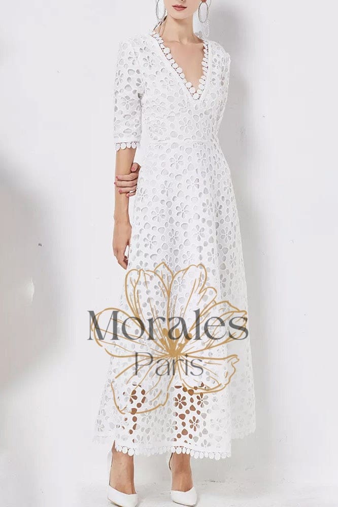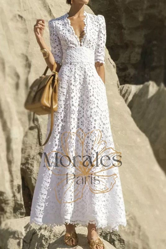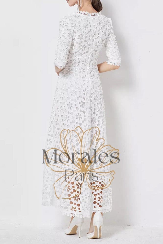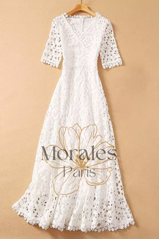 Affichez un look champêtre et élégant qui vous invite à la joie et à l’escapade en revêtant cette ravissante Robe Longue en Dentelle Blanche.