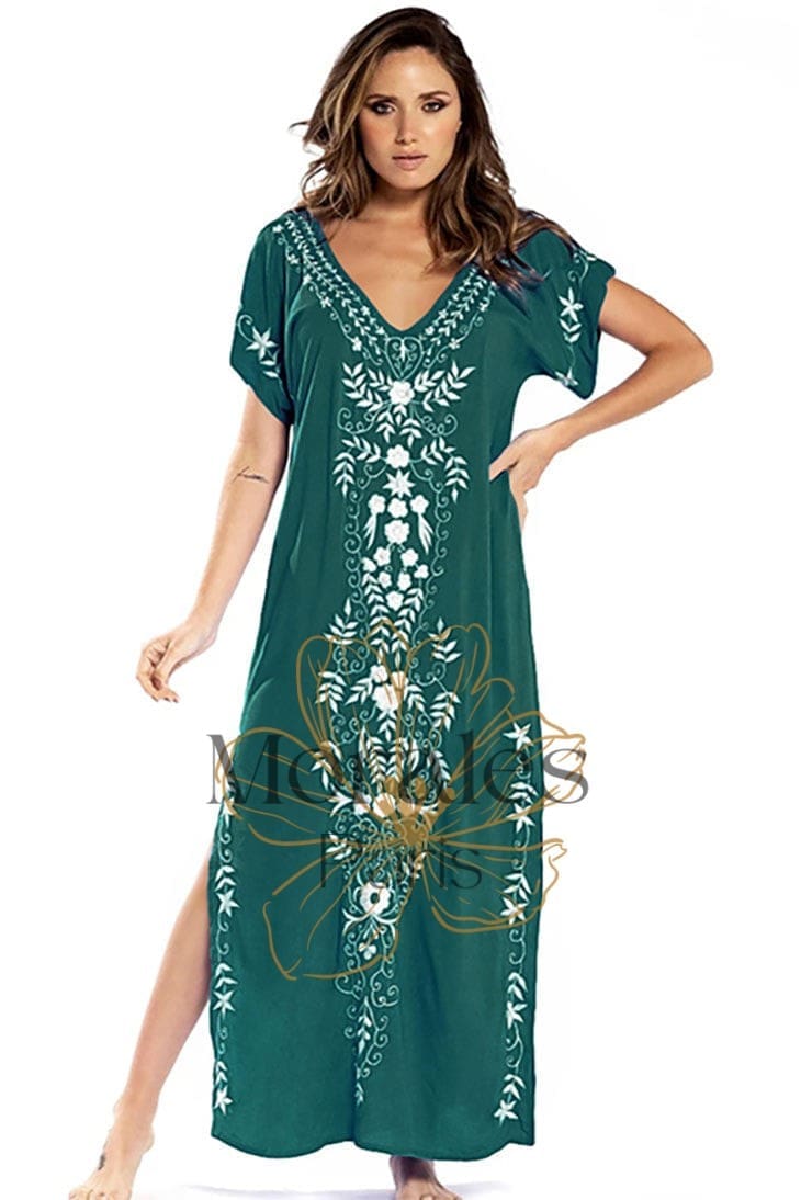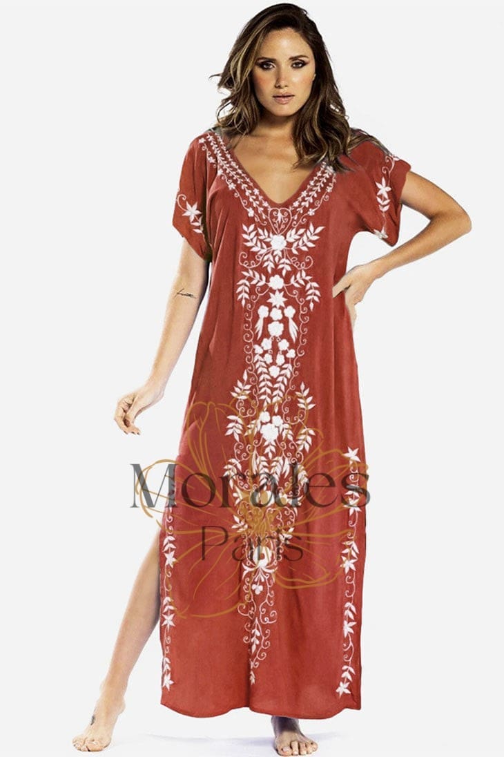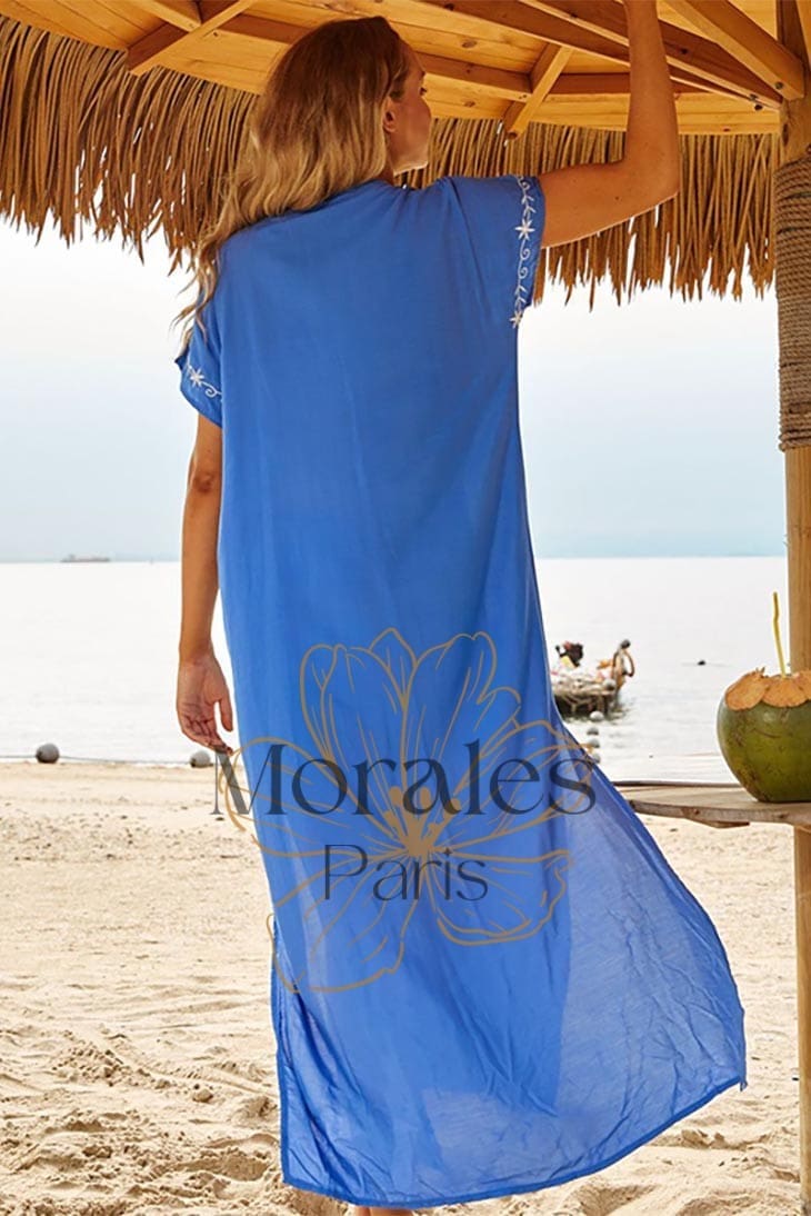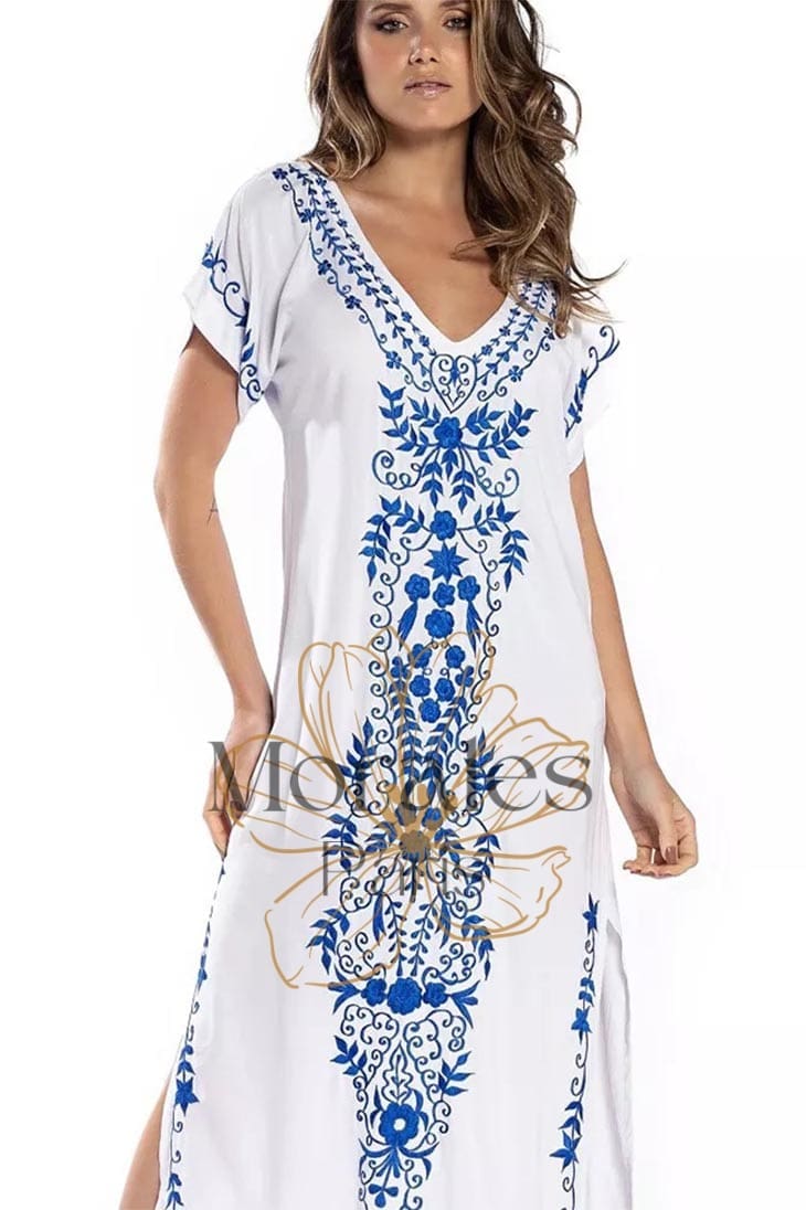 Cette robe maxi fluide est parfaite pour afficher votre teint ensoleillé, avec son décolleté en V profond et sa jupe fendue. La superbe broderie florale qui s’étend le long de la robe ajoute une touche de féminité et de romantisme, ce qui en fait le choix idéal pour un mariage d’été ou une journée à la plage.