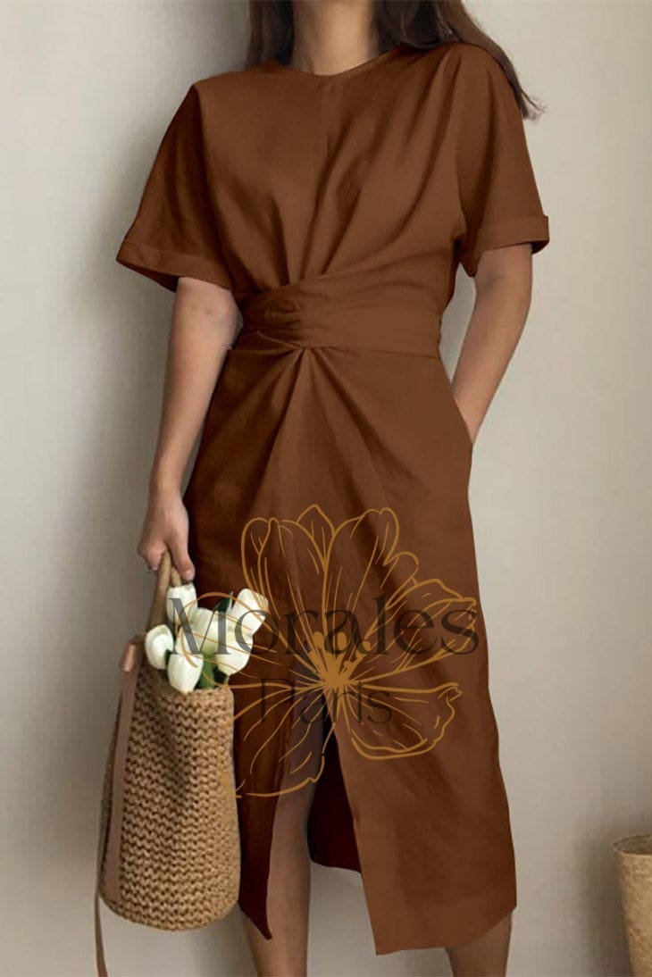 Cette robe époustouflante inspirée de la tendance bohème est parfaite pour toutes les femmes fashion. Avec sa teinte brun foncé, son col rond et son nœud en dos, cette robe exprime la féminité et le chic. La jupe fendue et les manches mi-longues ajoutent un côté séduisant, tandis que la silhouette est flatteuse et moulante.
