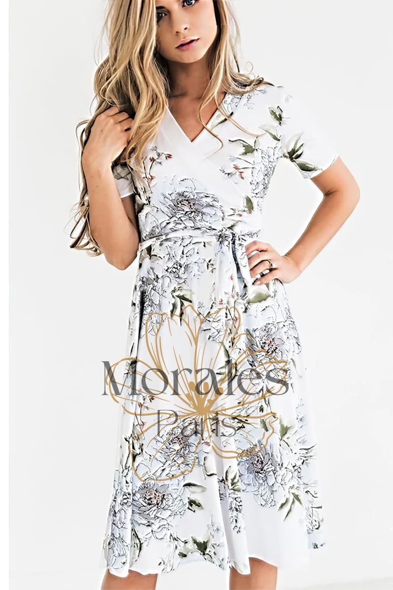 Cette robe blanche seyante est parfaite pour les journées chaudes. La coupe empire offre un ajustement flatteur, et l’imprimé fleuri ajoute une touche féminine. Le col en V est à la fois élégant et pratique, permettant de se rafraîchir aisément. Vous aurez l’air frais et vous sentirez à l’aise dans cette robe, que ce soit pour une promenade sur un marché de producteurs ou pour siroter des cocktails au bord de la piscine.