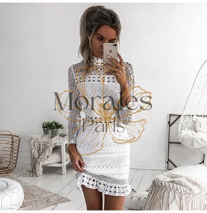 Tunique bohème courte cintrée, de couleur unie blanche, ornée de dentelle sexy