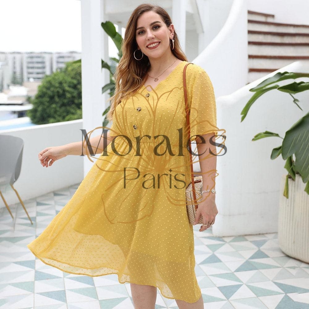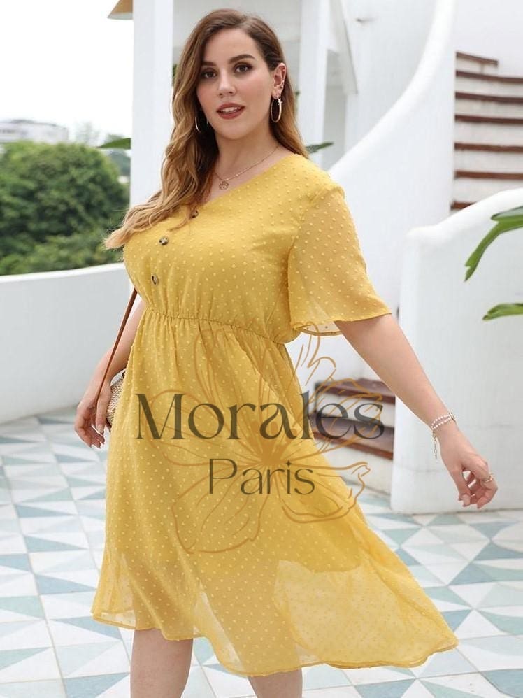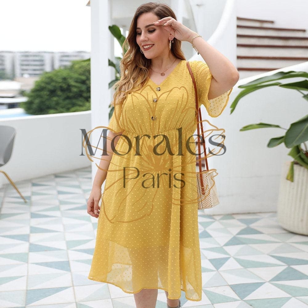 Révélez votre beauté avec cette robe jaune bohème semi-transparente. Sa coupe en col V est ornée de trois boutons à la poitrine. Son motif à pois et sa transparence font de cette longue robe jaune une pièce parfaite pour l’été. Une sensation bonne mine et des looks garantis !