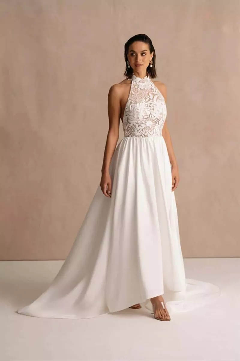 Robe de mariée moderne et audacieuse.Corsage en dentelle à grosses fleurs, encolure américaine, grand dos nu.Jupe asymétrique évasée, taille cintrée, en taffetas, avec une jolie traîne. Taille : 40Une seule pièce disponible. Pourquoi on l’aime ? Pour sa coupe unique, qui fait honneur aux souliers.
