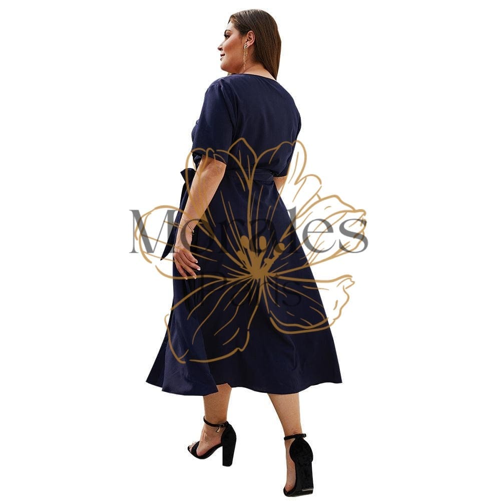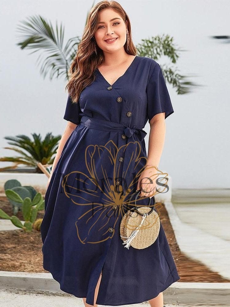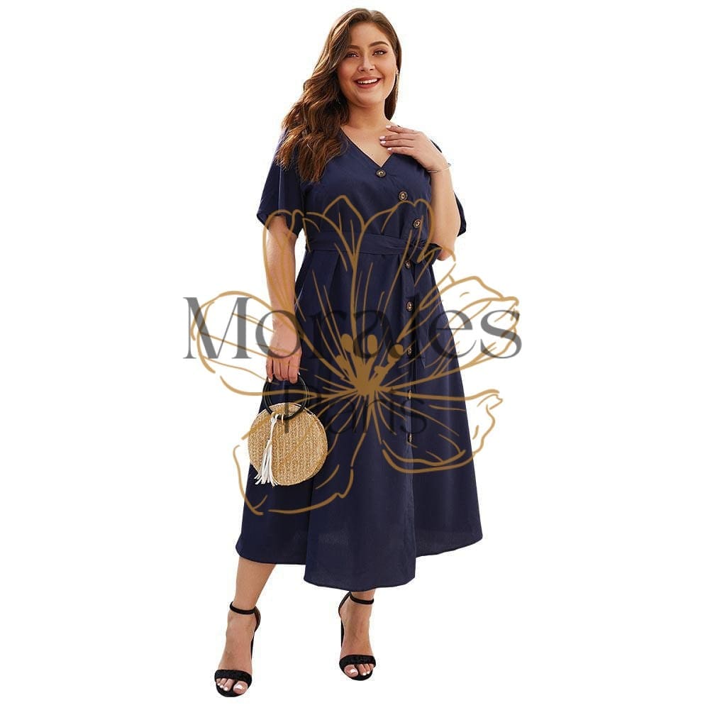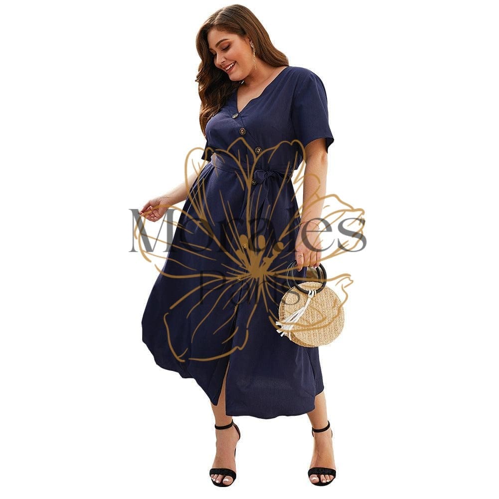 Une parure longue descendant jusqu’à mi-mollet, faite en matière légèrement transparente, mais dont le coloris bleu marine cachera vos sous-vêtements. Elle est fermée par une série de boutons irréguliers allant du bas vers le haut. Associée à un ruban bleu et à des manches courtes, elle est parfaite pour un été bohème. Chez La Vie de Bohème, elle est disponible même pour les grandes tailles.