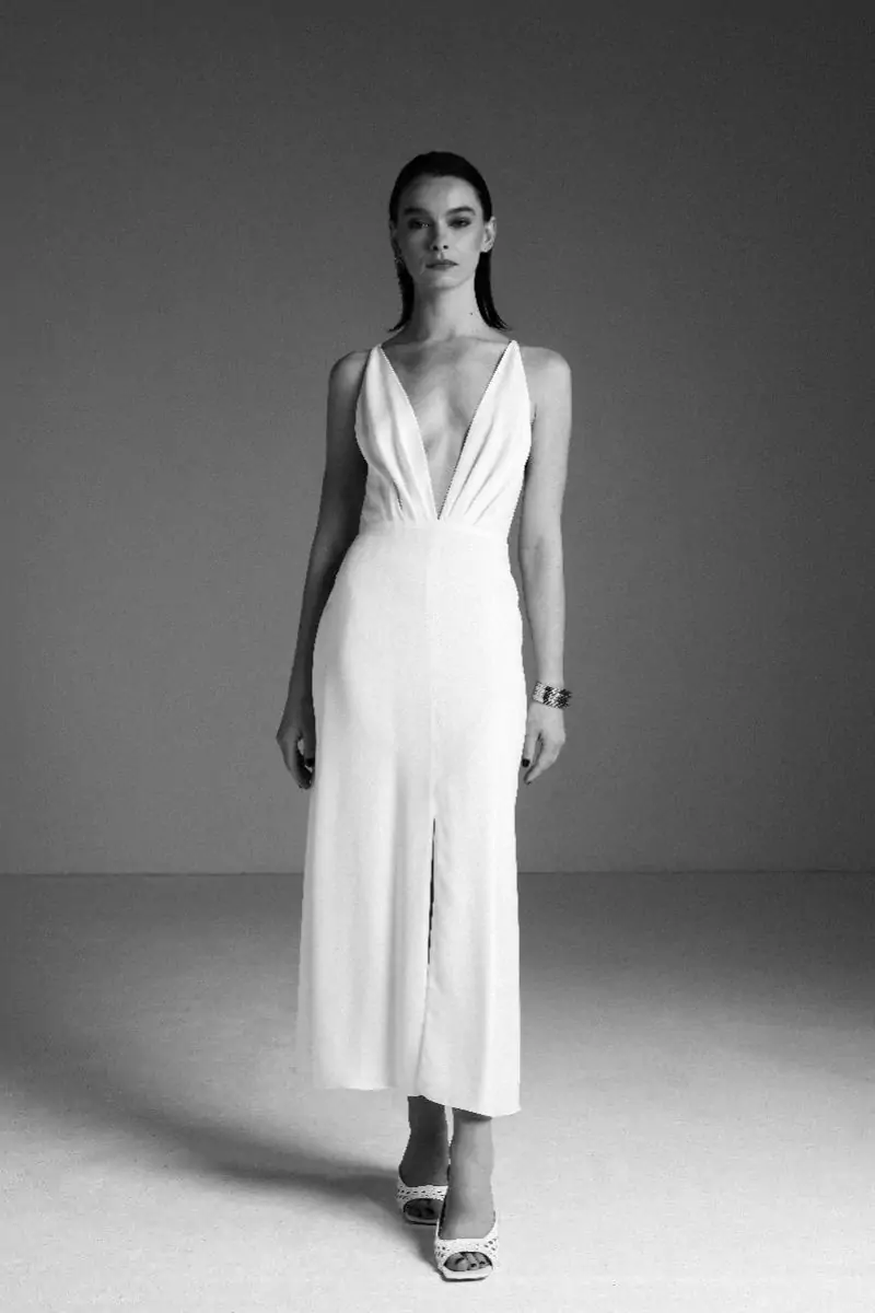 Robe midi pour mariage civil. Col V plongeant, dos nu bretelles croisées. Jupe ajustée au niveau des hanches et fesses puis droite, fendue au milieu. Une seule taille disponible : 38