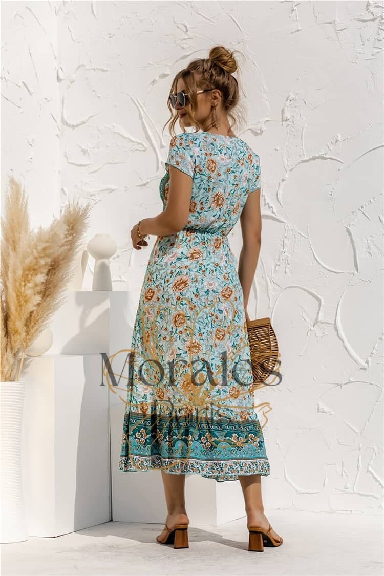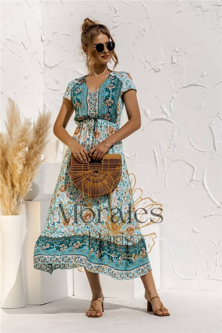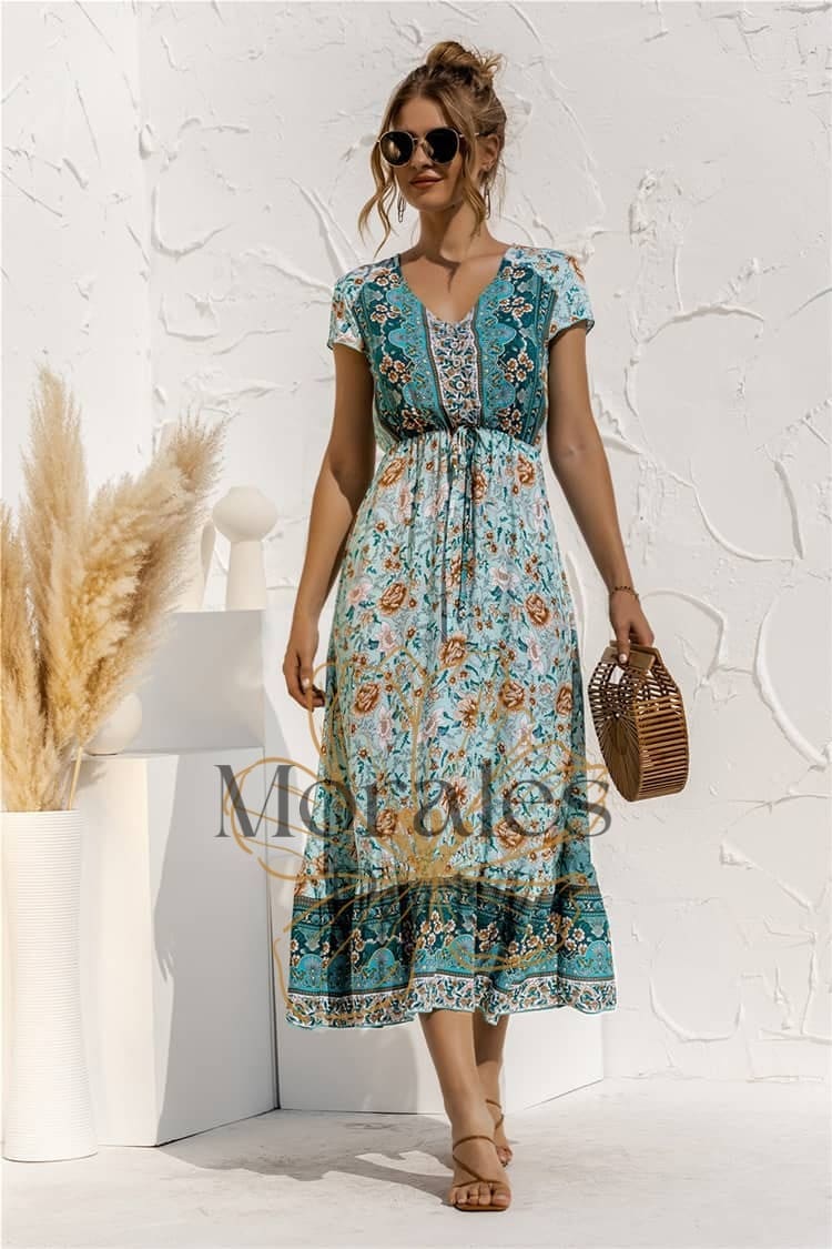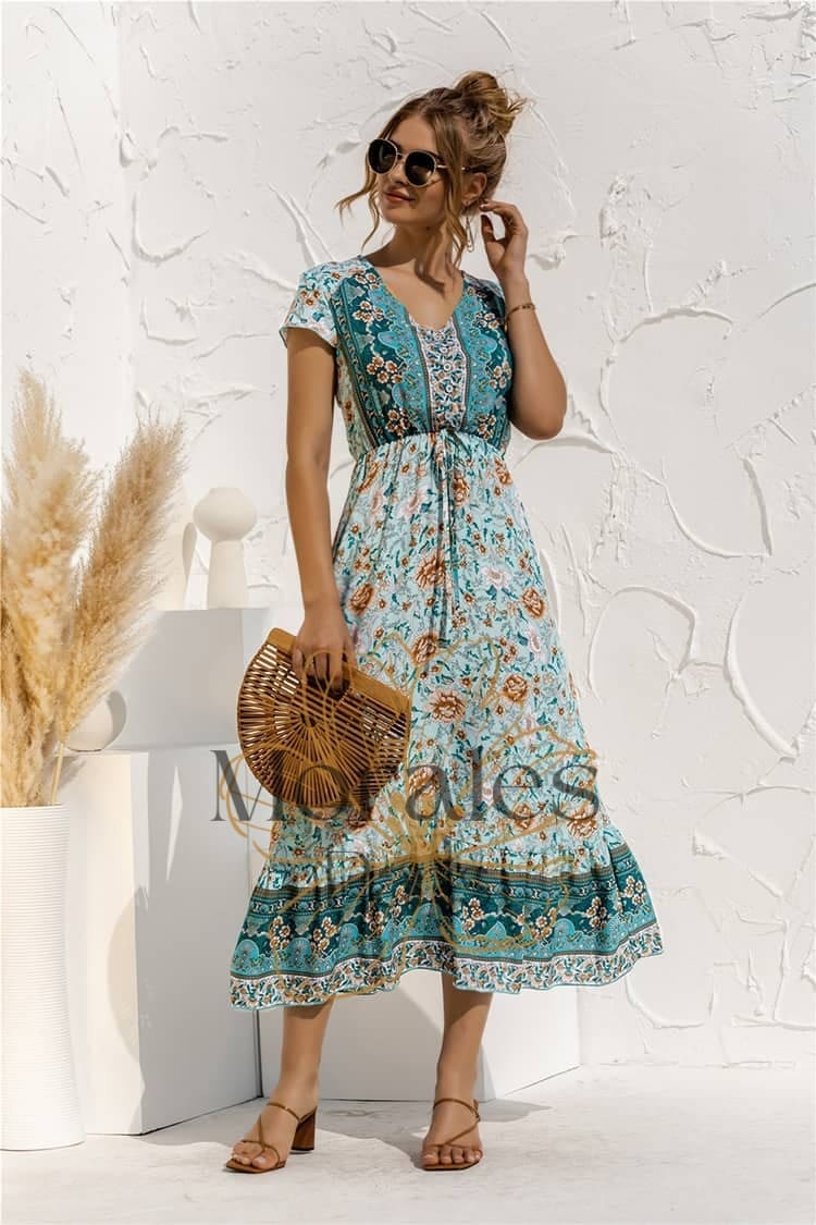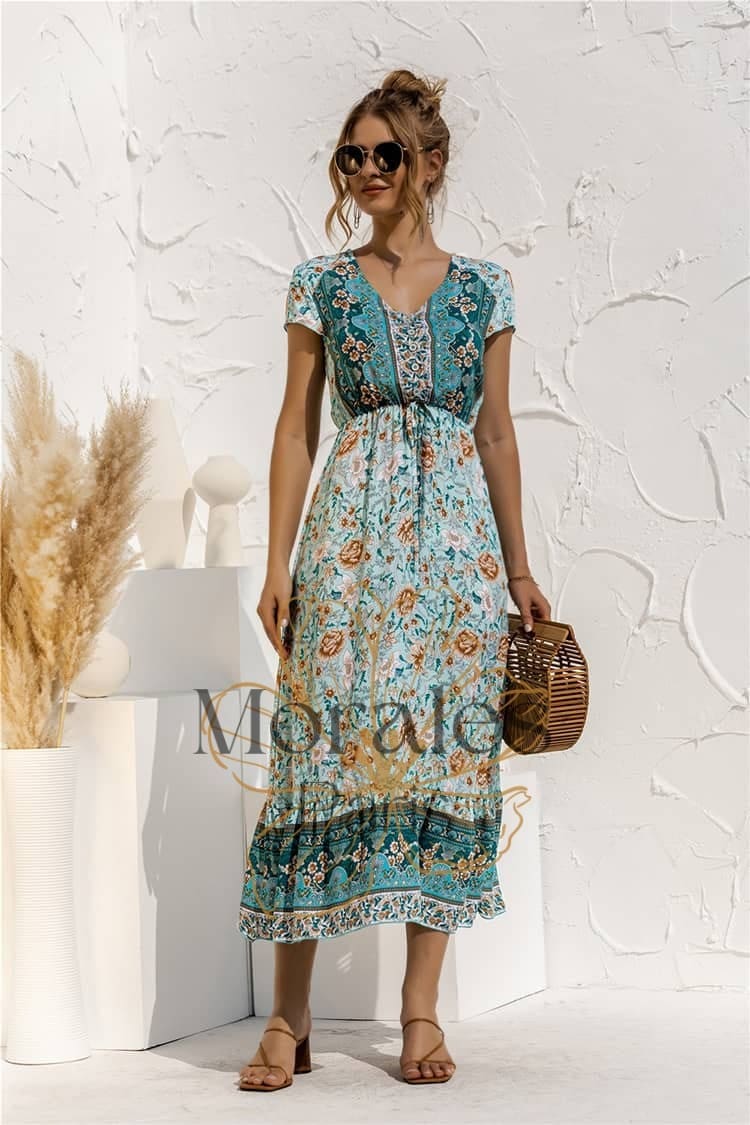 Une coupe fluide et des imprimés fleuris qui font de cette robe champêtre un must-have ! Elle est parfaite pour la saison estivale avec son coloris vert qui apporte fraîcheur et naturel. Son imprimé floral évoque une grande inspiration bohème.