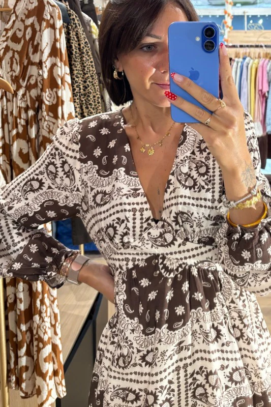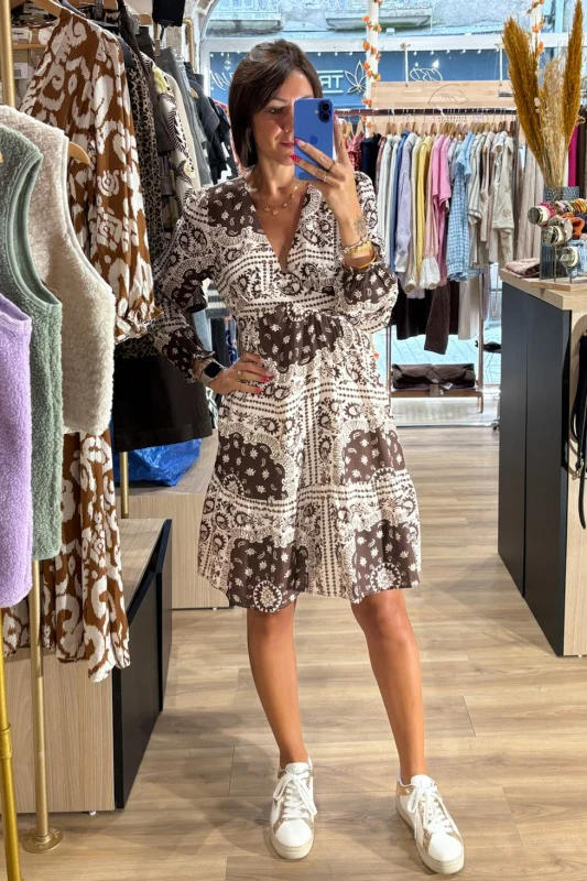 Robe écru à imprimés chocolat – Élégante et fluide, cette robe se distingue par son coloris écru rehaussé de motifs chocolat. Elle présente un col V féminin, des manches longues et une coupe confortable. Confectionnée dans une matière douce et agréable (90% viscose, 10% polyamide), elle allie style et confort, idéale pour un look chic au quotidien ou en soirée.