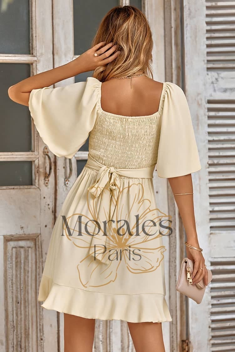 Robe courte à coupe cintrée et dos smocké Encolure en V et manches mi-longues évasées Disponible en Beige & Bleu ciel Fabrication en Polyester Habillez-vous d’une robe chic et champêtre Vous cherchez une tenue qui allie à la fois chic et décontraction ? Alors, optez pour cette robe cintrée aux accents bucoliques. Une coupe flatteuse qui met en […]