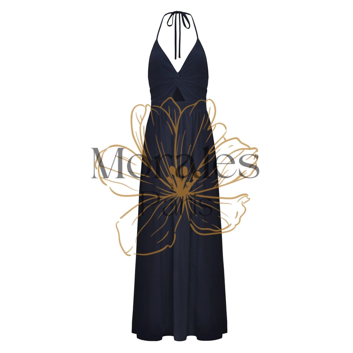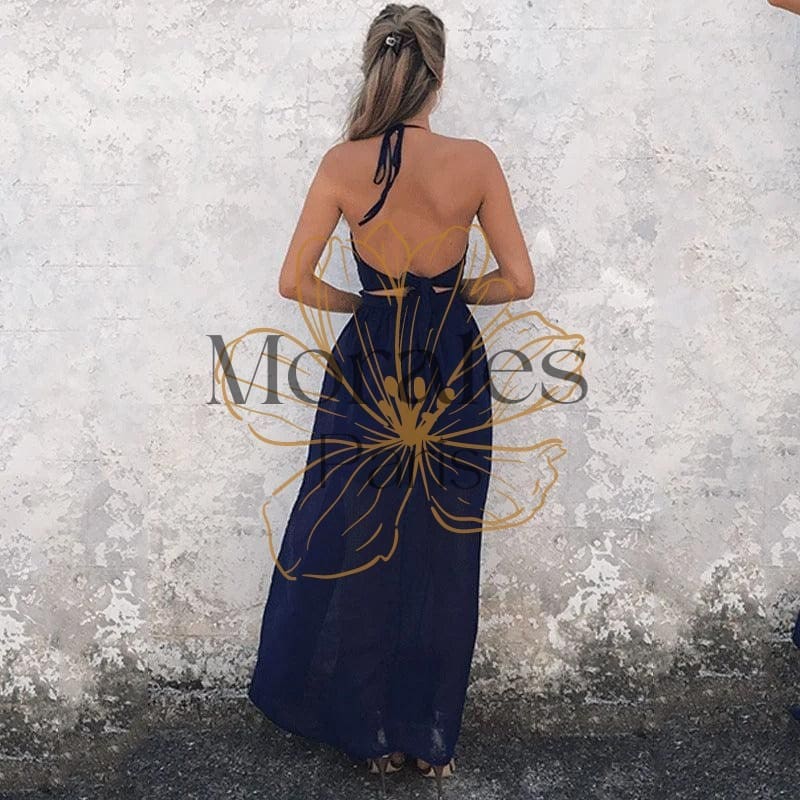 Une robe longue bleu marine, parfaite pour un cocktail, se compose d’ouvertures qui mettent en valeur vos jambes. Une bretelle mince vient se nouer autour de votre cou. Cette robe bohème chic est idéale lors de moments festifs. Complétez-la avec des jolies sandales à talons bohèmes et vous serez garantie d’un look impeccable !