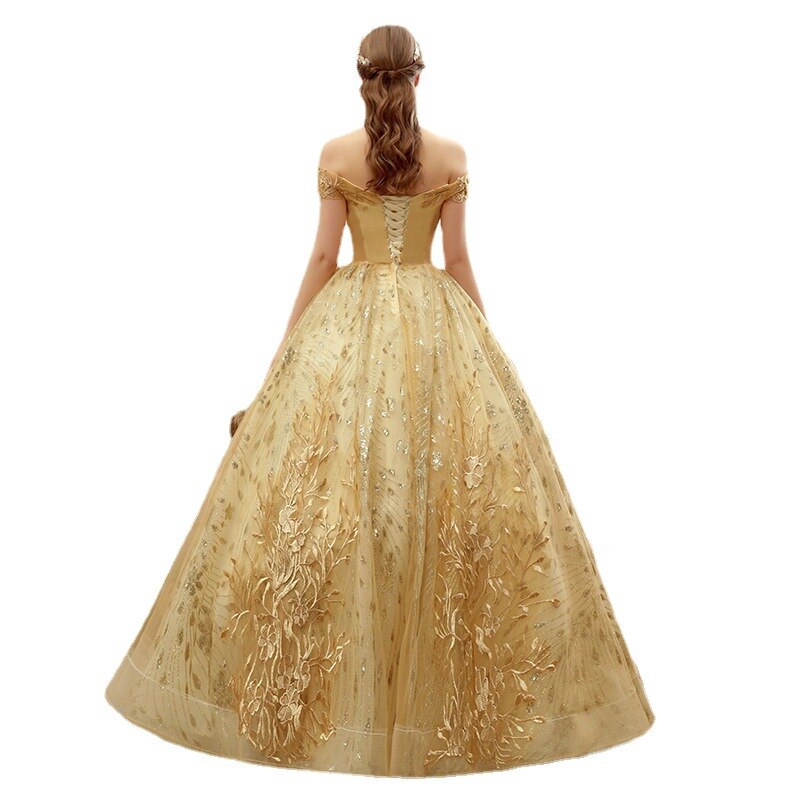 Cette robe en teinte dorée et ornée de motifs floraux séduit par son ingéniosité. Chaque détail, soigneusement élaboré, donne vie à une pièce unique qui ne passera pas inaperçue. Son allure vintage rappelle ces robes de princesses si prisées, rendant hommage à la mode d’antan tout en restant résolument actuelle. Ajoutez-y une couronne scintillante et regardez les compliments pleuvoir ! La robe est offerte dans une gamme de tailles allant du 32 au 44.