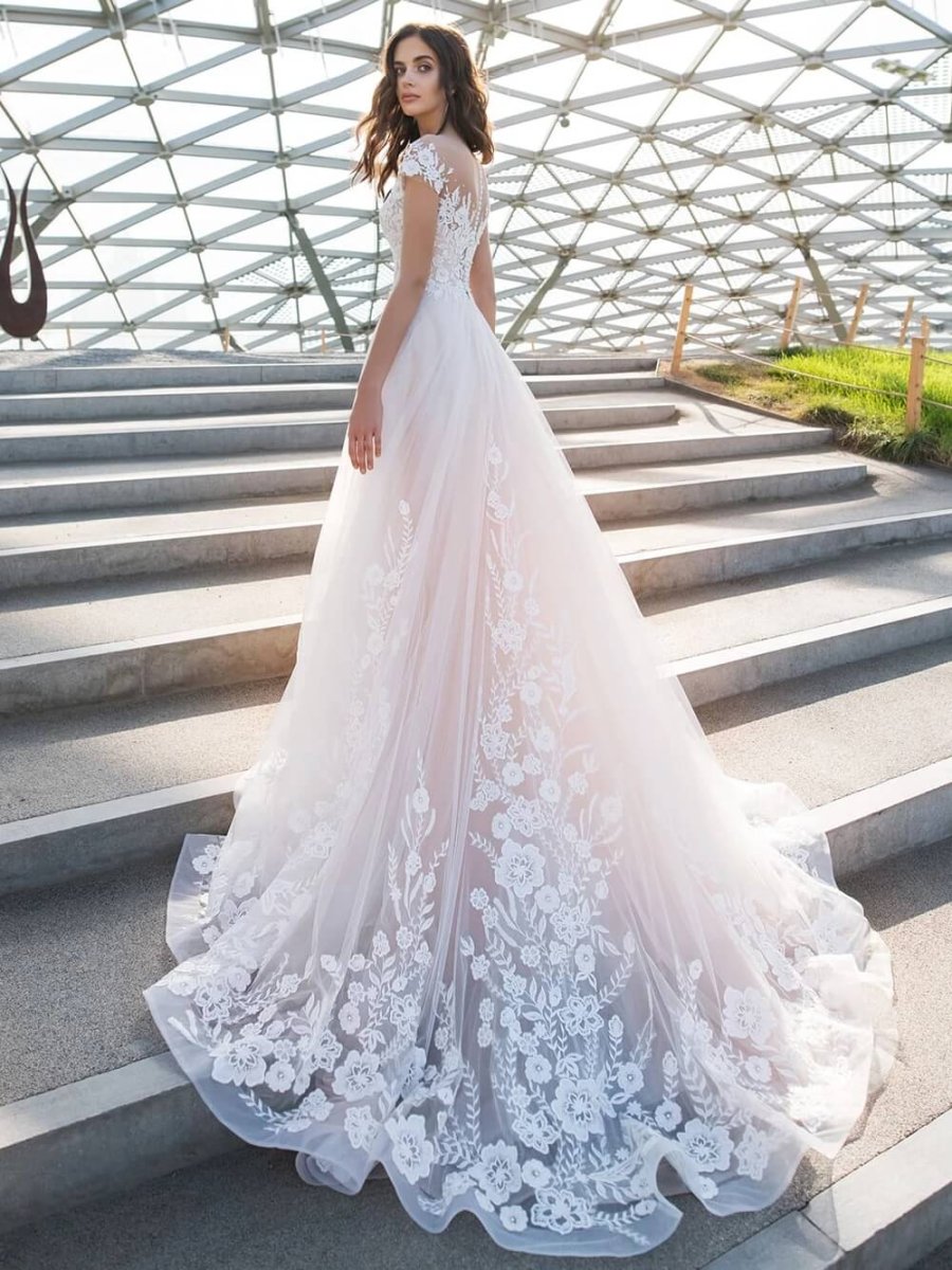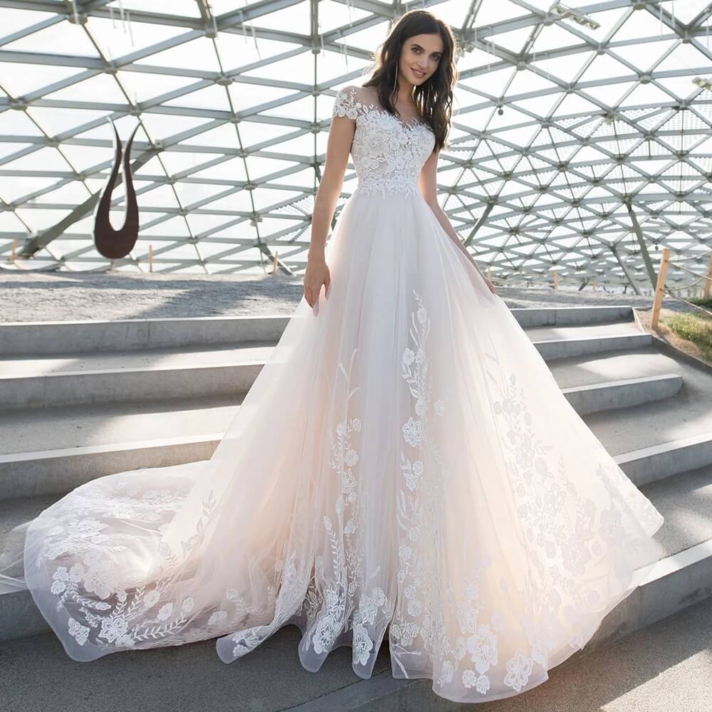 Plongez dans l’élégance avec cette robe de mariée féérique aux manches courtes, où de délicates fleurs en dentelle s’entrelacent sur un corsage transparent. La jupe volumineuse en tulle ajoute une touche raffinée, faisant tourner les têtes lors de votre grand jour.