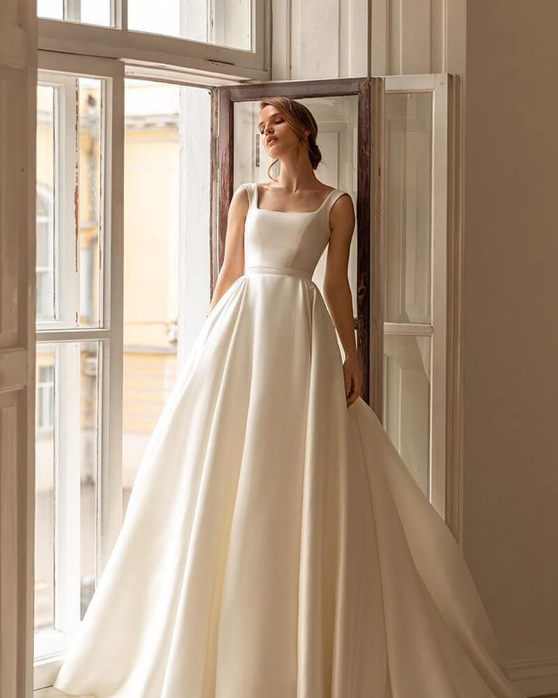 Pour marquer ce jour exceptionnel, optez pour une robe qui allie tradition intemporelle et modernité. Ce modèle à la silhouette princessesque ne manquera pas de vous émerveiller, grâce à ses manches bouffantes et son corset amovible qui vous permet d’ajuster votre look selon les moments de la journée, qu’il s’agisse de l’échange des vœux ou de votre première danse enivrante ! Avec un décolleté carré et des bretelles nouées, cette pièce vous garantit une allure aérienne et délicate. Sa traîne vous fera tourner la tête, comme une véritable reine !