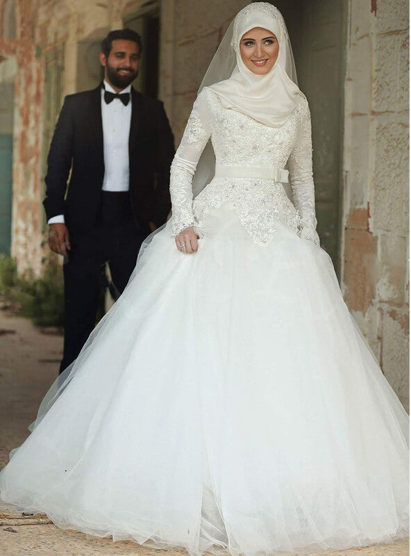 La jupe, conçue avec des couches de tulle, apporte une touche majestueuse qui fait de vous la reine de la journée. Les détails en dentelle délicate sur le bustier et les manches longues ajoutent une note raffinée à l’ensemble, avec des motifs floraux qui sauront séduire les regards admiratifs.