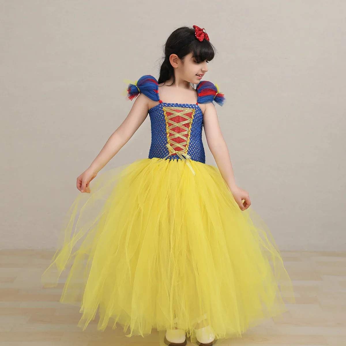 Le corsage, au tissu délicat, se marie harmonieusement avec une jupe en tulle lumineuse, évoquant la robe classique de Blanche Neige, tandis qu’un joli nœud rouge apporte la touche finale à cette tenue de rêve.