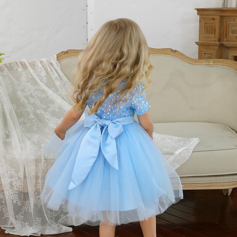 Ce qui rend cette robe aussi spectaculaire, c’est son bustier scintillant. Il capte la lumière pour faire briller votre petite étoile, même sous le soleil d’été. Les appliques brillantes sont fixées avec soin, et devinez quoi ? Elles sont lavables ! Les manches courtes sont confectionnées dans un textile à la fois très résistant et d’une douceur incroyable, parfait pour les petites exploratrices.
