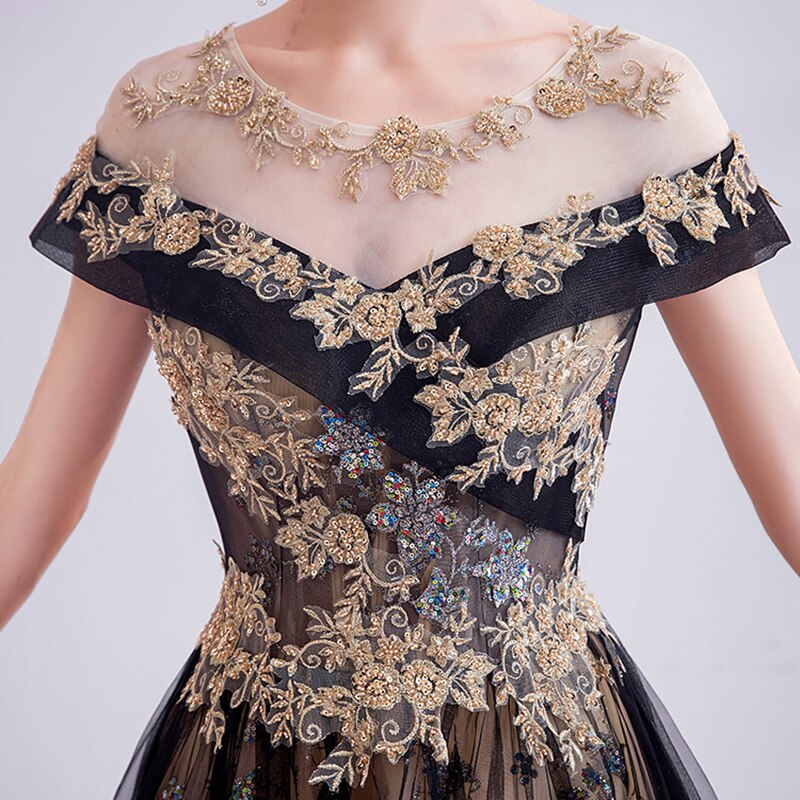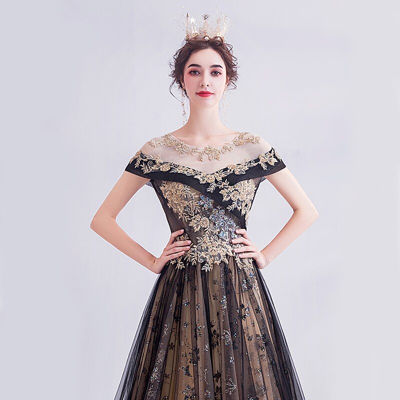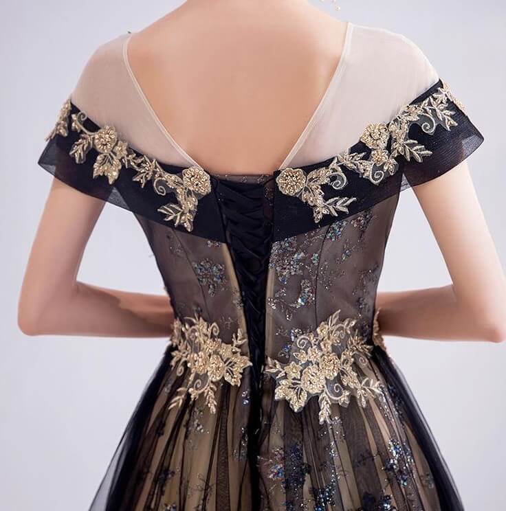 Cette robe dispose d’un col rond à l’avant et d’un dos en V, sans manches, vous offrant une sensation de légèreté et de confort incroyable. Que vous dansiez jusqu’au bout de la nuit ou que vous profitiez d’un cocktail entre amis, cette création vous garantit une allure chic. Les jeux de textures entre le drapé sombre et les embellissements dorés illuminent votre look, vous rendant véritablement rayonnante.