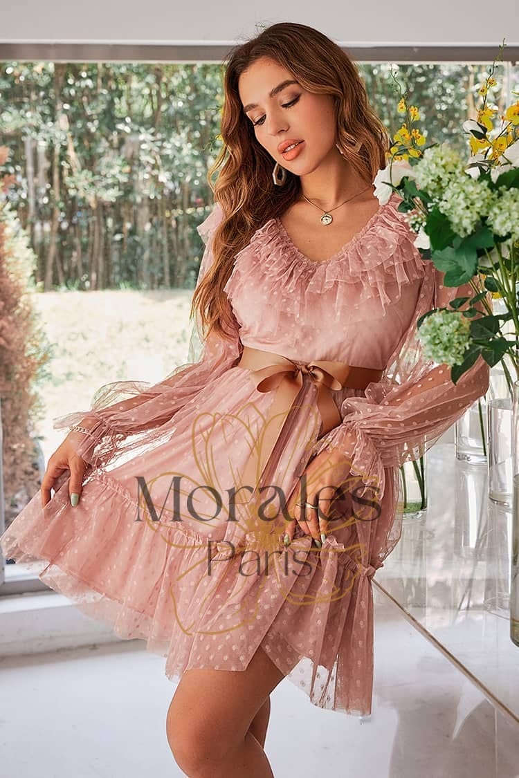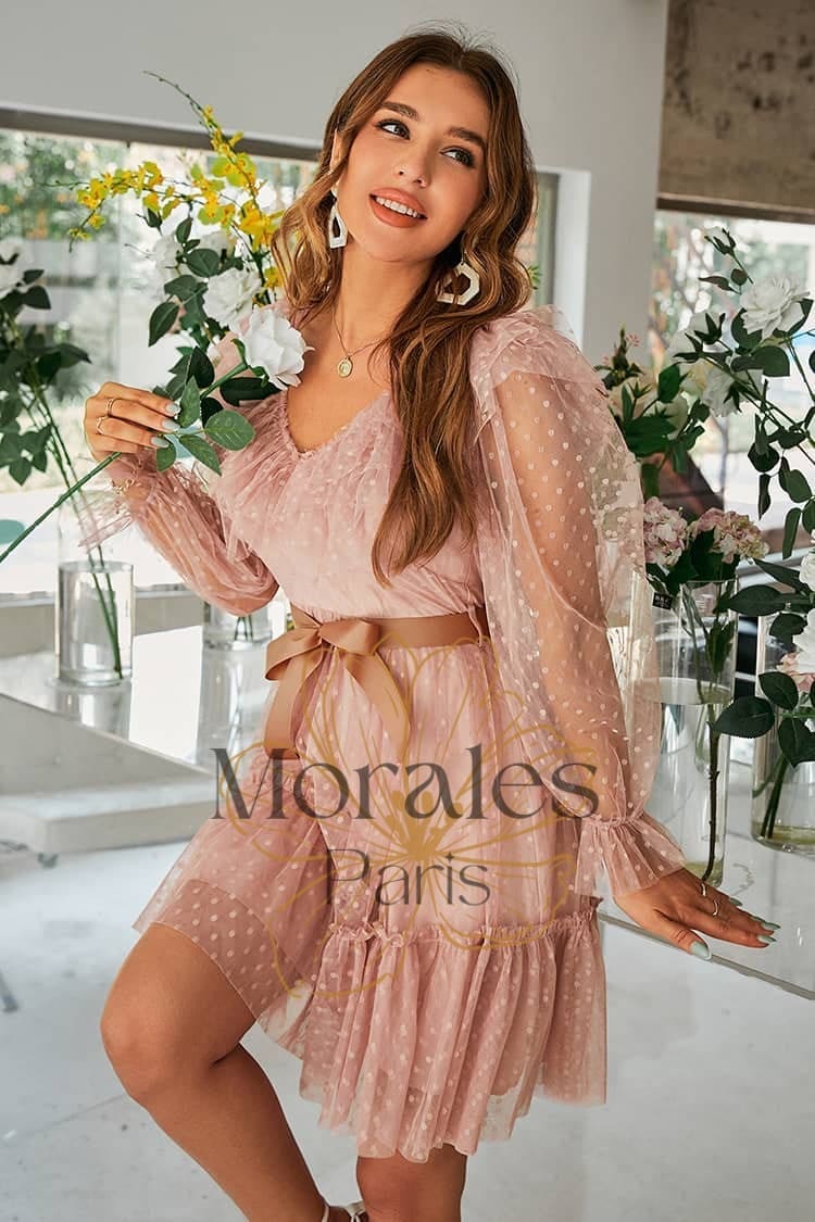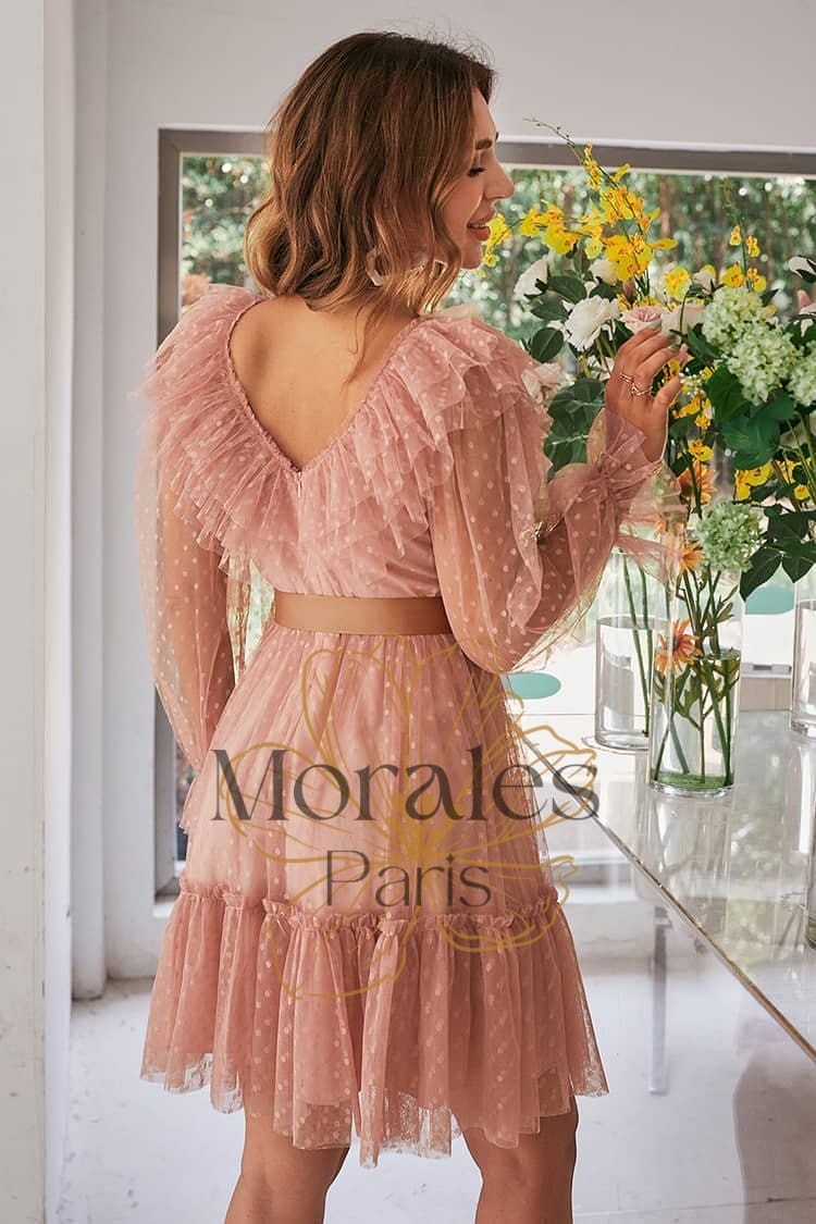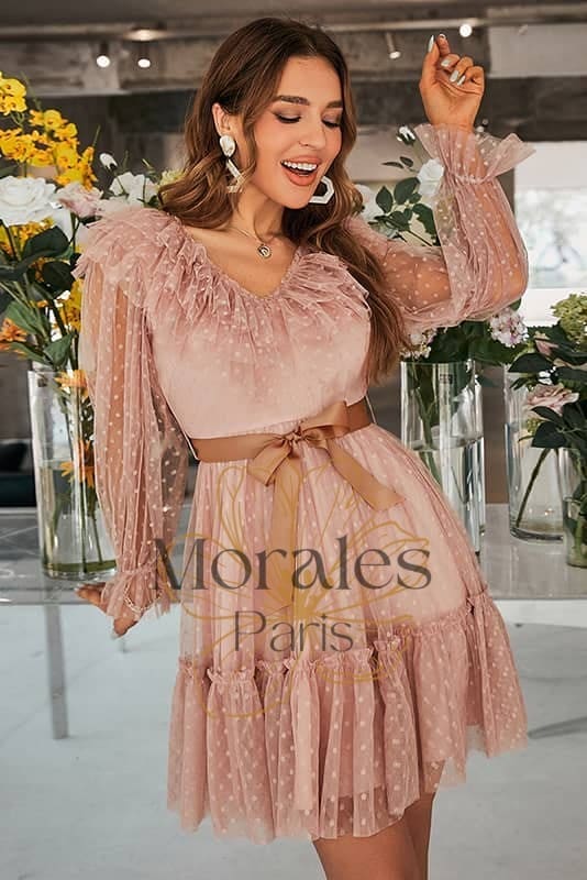 Tenue courte avec encolure en V volantée Manches longues Motifs à pois et couleur Rose Fabriquée en Polyester Robe demoiselle d’honneur rose courte champêtre Un mélange de subtilité et de féminité, cette robe te donne un look authentiquement champêtre. Pour une tenue de demoiselle d’honneur absolument parfaite, cette robe bucolique et charmante est un must […]