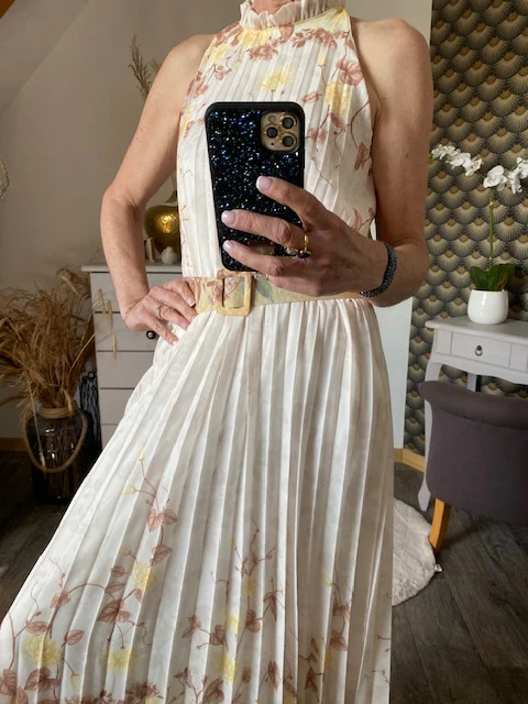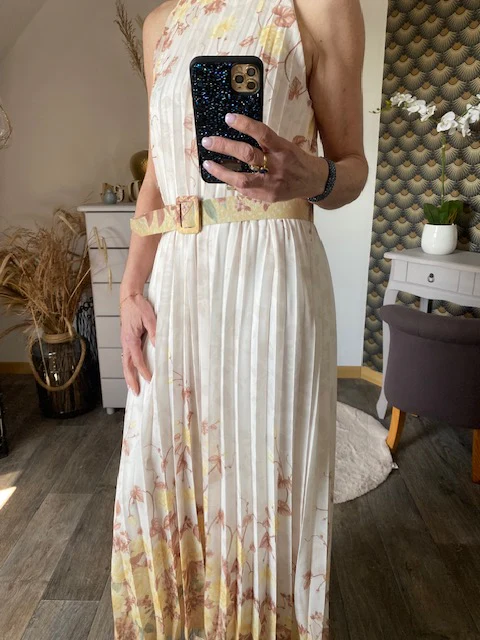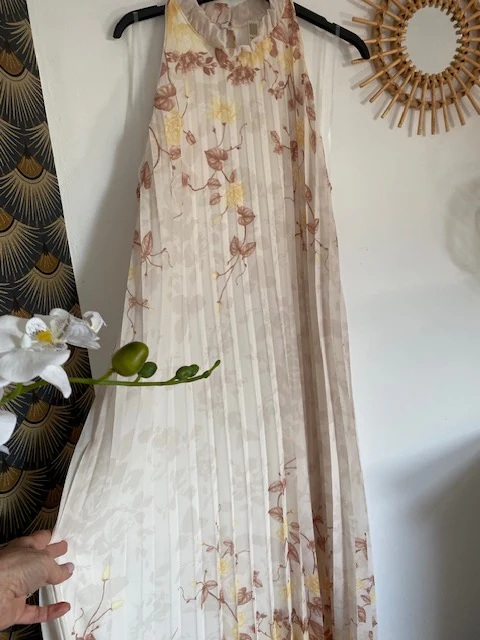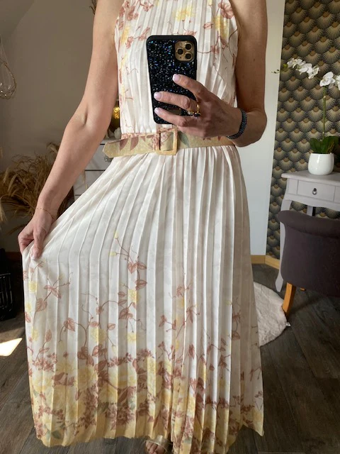 Robe doublée , magnifique , sans manche avec fermeture par bouton dans la nuque , très élégante , doublée jusqu ‘ aux genoux , vendu avec ceinture assortie .