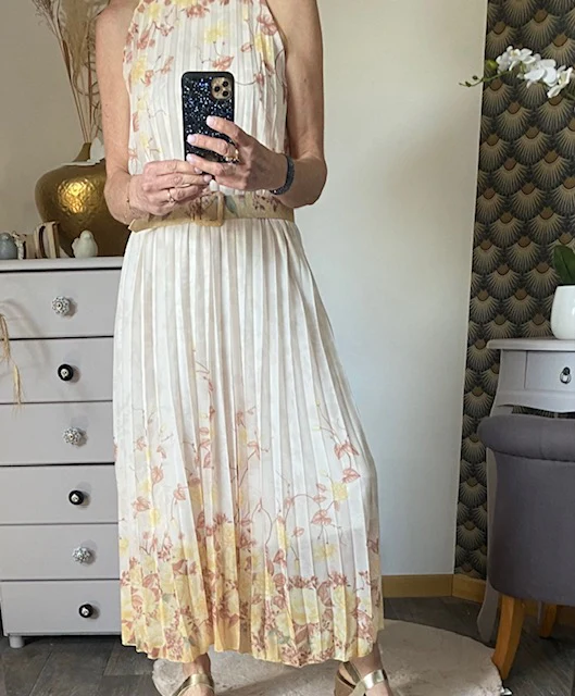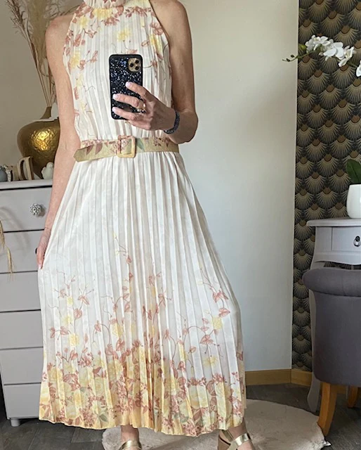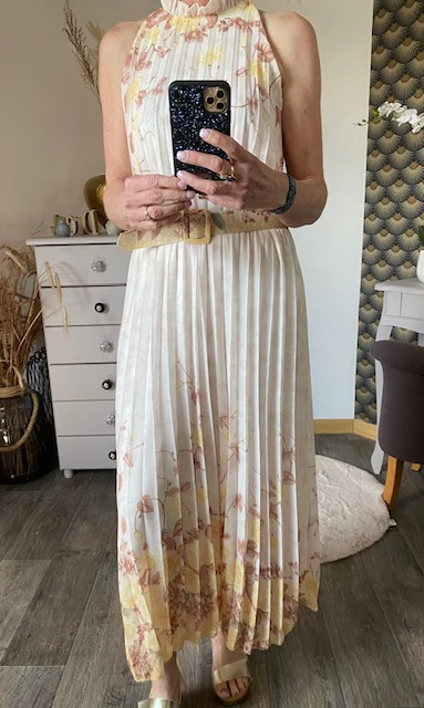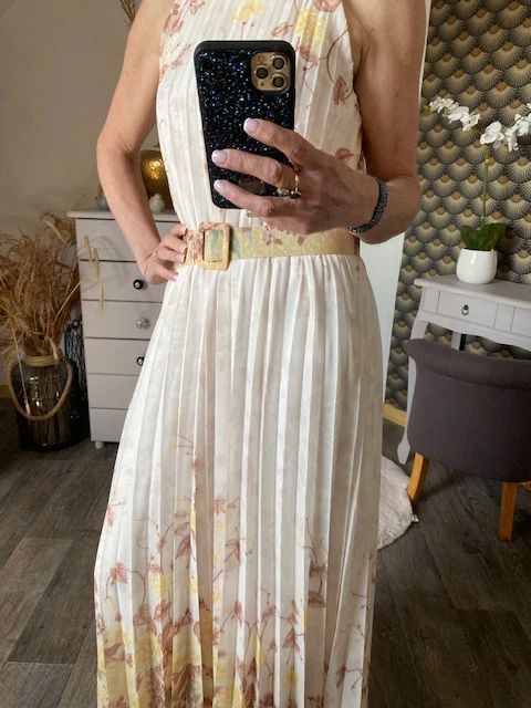 Robe doublée , magnifique , sans manche avec fermeture par bouton dans la nuque , très élégante , doublée jusqu ‘ aux genoux , vendu avec ceinture assortie . NOUVELLE COLLECTION PRINTEMPS/ETE 2025 MADE IN ITALIE Composition : 95% VISCOSE ET % ELASTHANE Longueur : 133 cm largeur : 58 cm