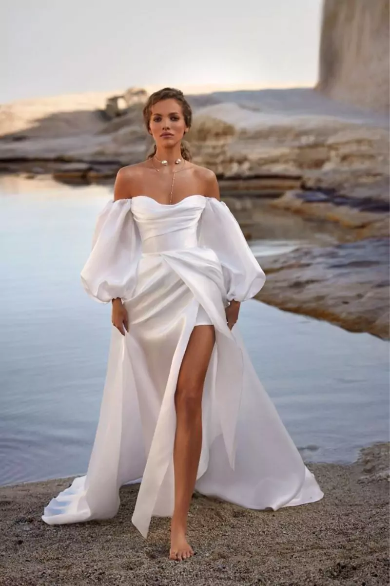 Robe de mariée élégante et surprenante en organza.Coupe en A, manches longues bouffantes à épaules dénudées.Corset drapé en cœur, dos nu à lacets.Jupe longue fendue, effet port-feuille. Tailles : 38Une seule pièce disponible. Pourquoi on l’aime ? Pour son allure digne du red carpet.