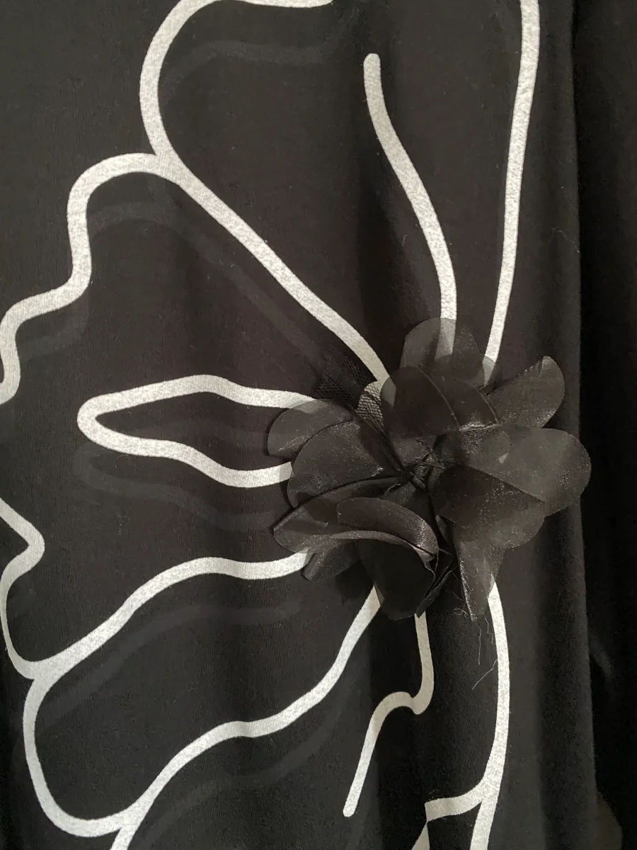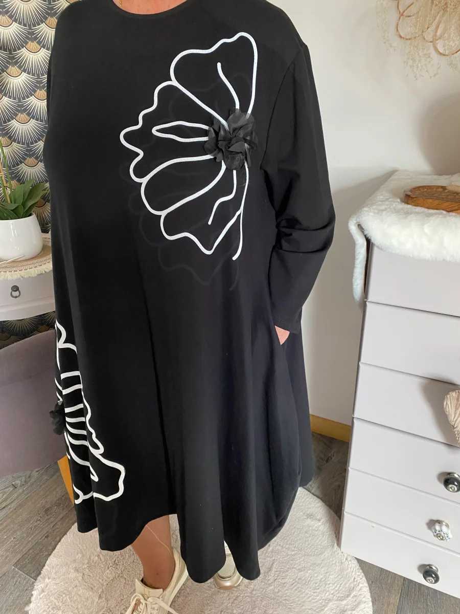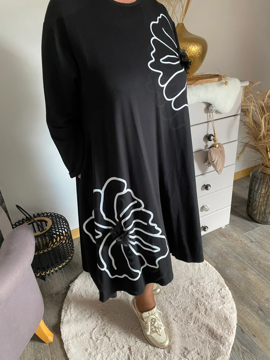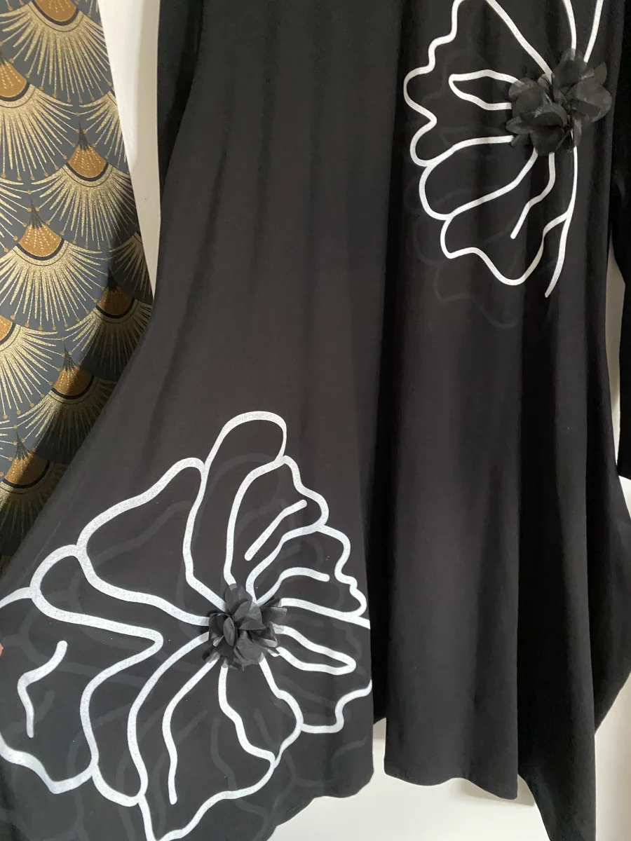 Robe longue asymétrique , avec deux poches , fleurs tulles brodées sur le devant .manches longues.