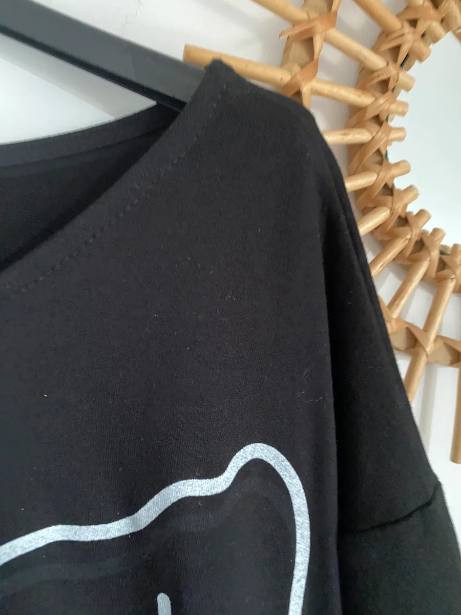 Robe longue asymétrique , avec deux poches , fleurs tulles brodées sur le devant .manches longues. NOUVELLE COLLECTION AUTOMNE HIVERS 2025 MADE IN ITALIE 100% COTON Longueur: 109 cm largeur : 71 cm Le modèle mesure 1.68 m taille en haut 46 et en bas 44