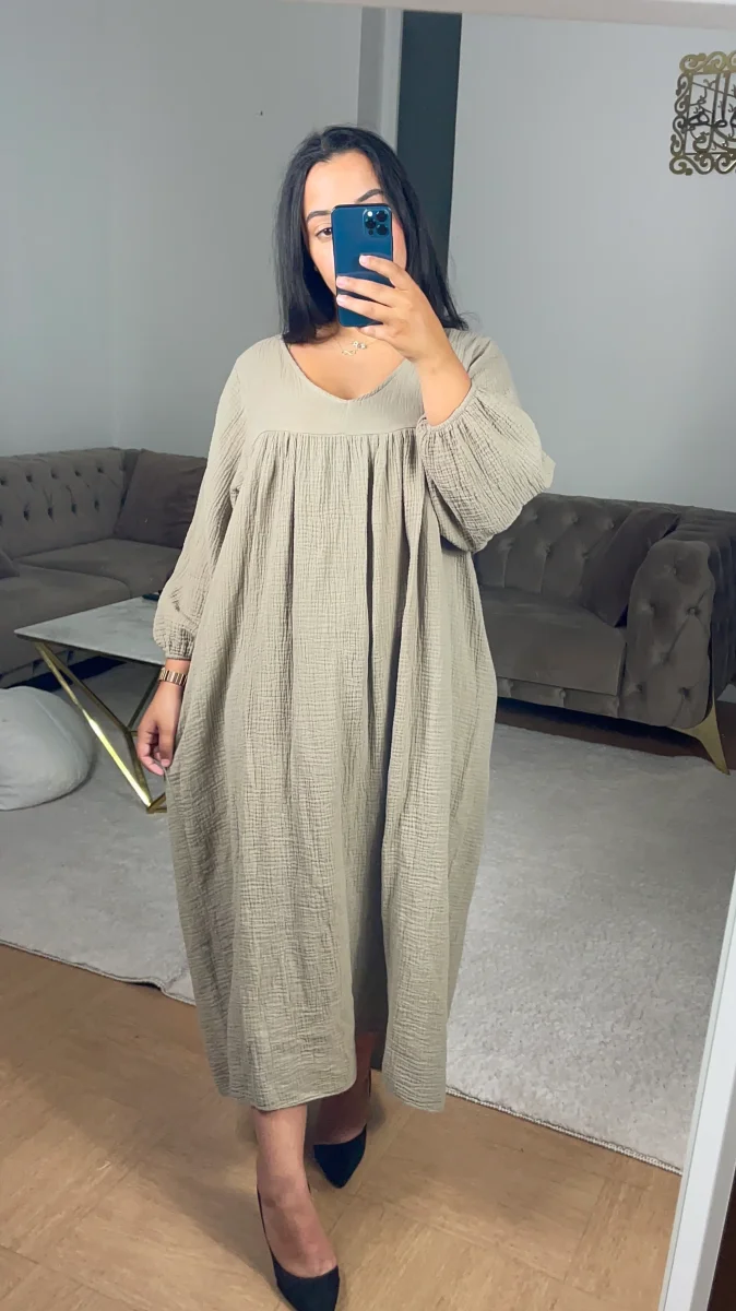 Cette robe légère et aérienne est confectionnée dans une matière de qualité supérieure, offrant un confort optimal tout au long de la journée. Son col en V flatteur ajoute une touche féminine et élégante à l’ensemble. La matière gaze de coton confère à la robe une texture douce et respirante, parfaite pour les journées chaudes.