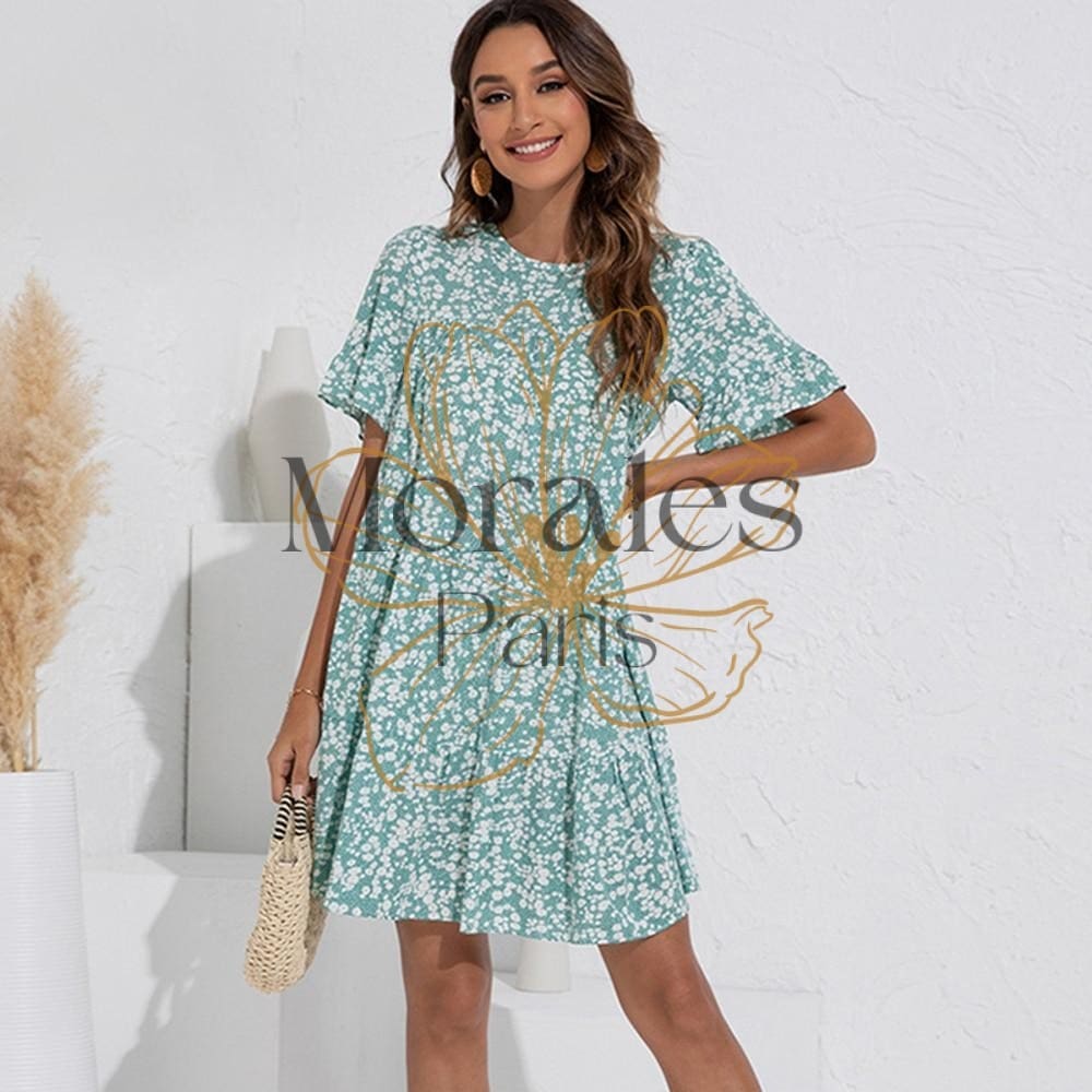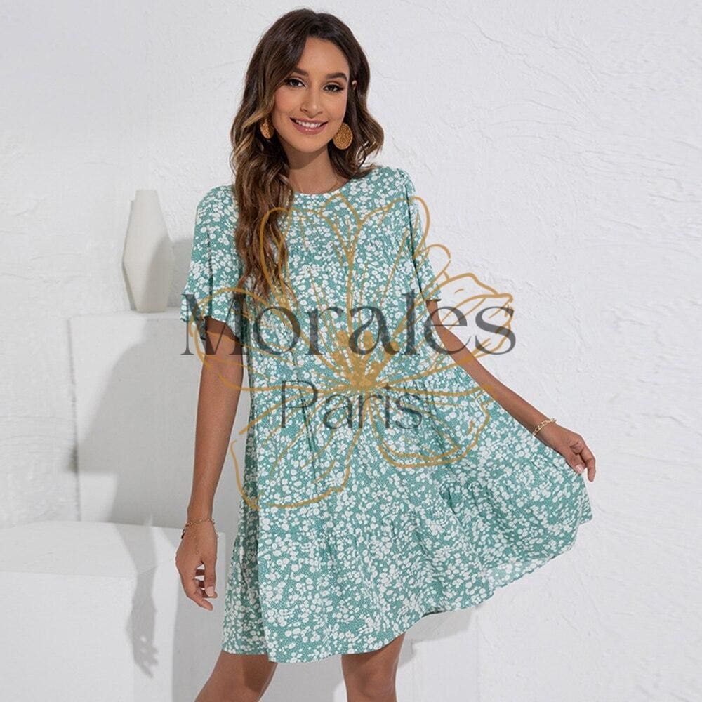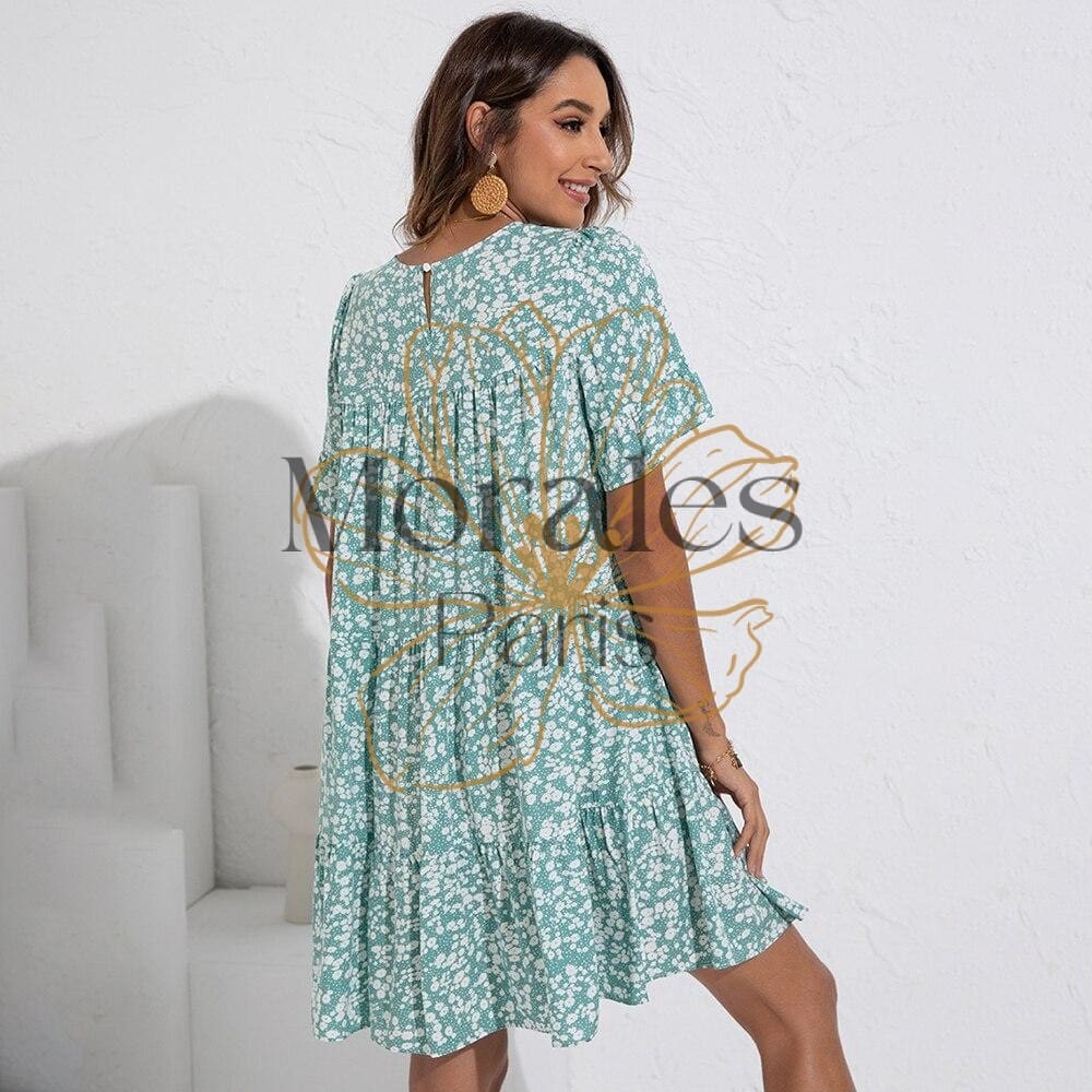 Robe courte bohème pour style hippie chic, imprimé floral et col rond