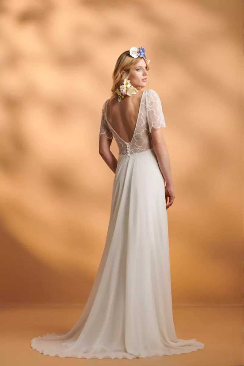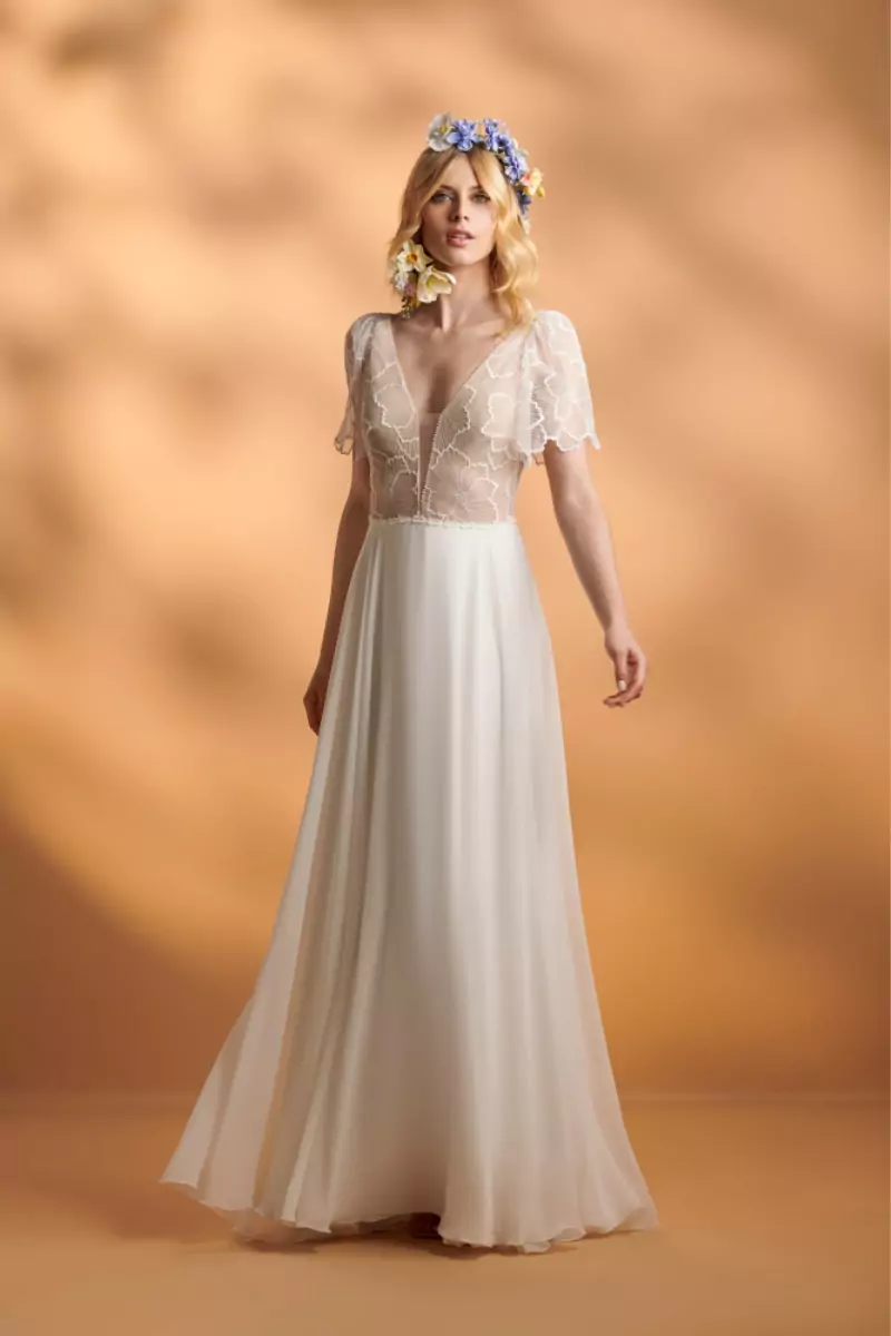 Robe de mariée intemporelle et romantique.Buste en tulle brodé de fleurs et doublé nude clair.Décolleté plongeant, manches courtes larges, dos nu V boutonné.Jupe taille évasée et fluide en mousseline avec traîne. Taille : 40Une seule pièce disponible. Pourquoi on l’aime ? Pour sa souplesse et sa douceur.