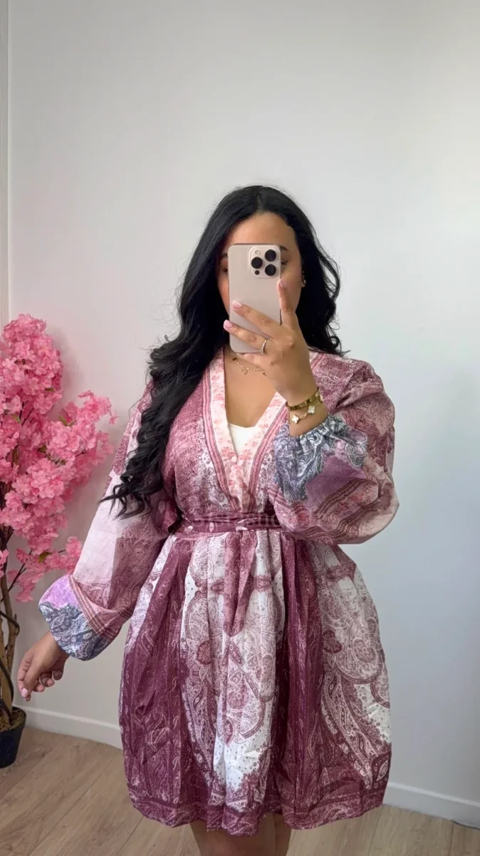 Robe imprimée mi-longue au joli volume. Son tissu léger et fluide lui donne un tombé élégant, tandis que sa coupe ample et structurée ajoute une touche bohème. La ceinture intégrée permet de marquer la taille.