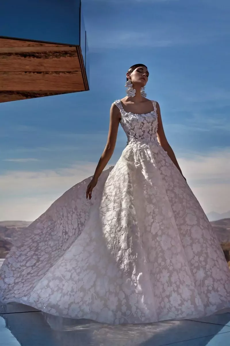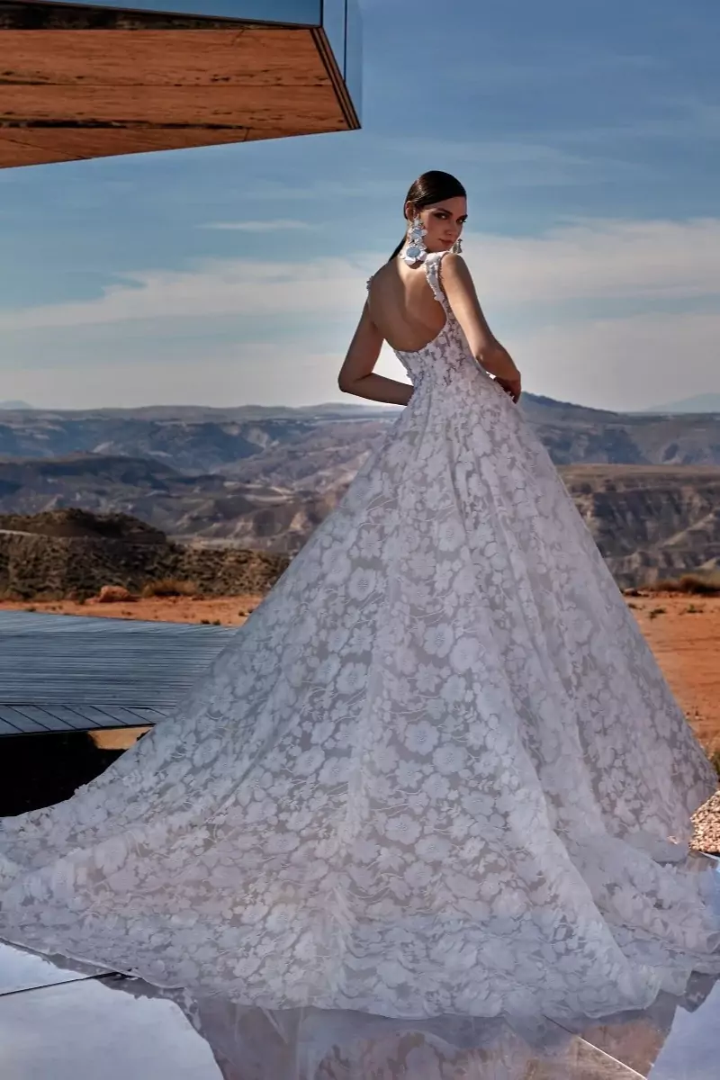 Robe de mariée princesse A-line grandiose en dentelle à motifs fleurs.