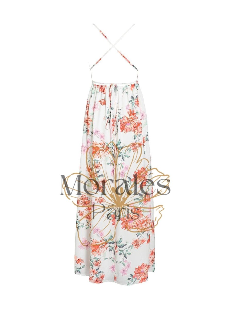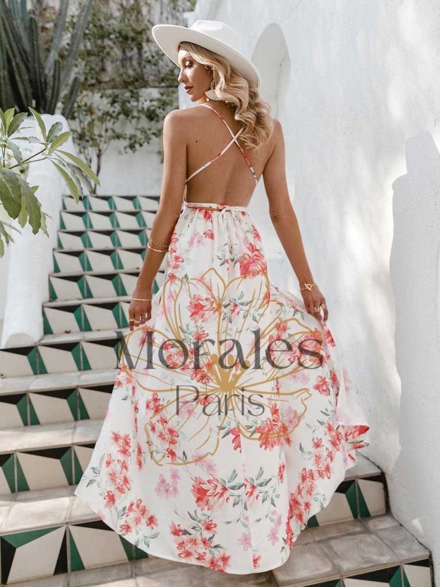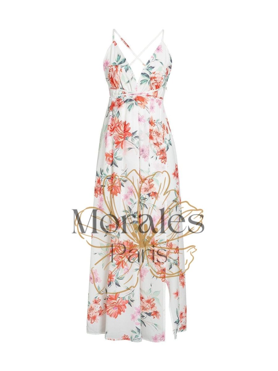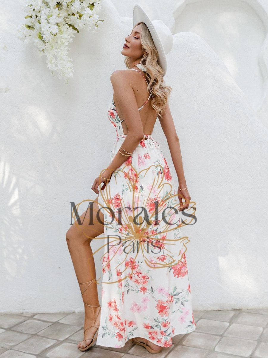 Si vous aimez les looks bohèmes, cette robe est indispensable ! La robe longue blanche est ornée d’un motif floral dans des nuances de vert, de bleu et de rose. Confectionnée dans un tissu léger, elle vous permet de rester à l’aise même les jours les plus torrides. Qu’il s’agisse d’aller à la plage ou de sortir au restaurant, cette robe est l’alliée parfaite pour toutes vos sorties !