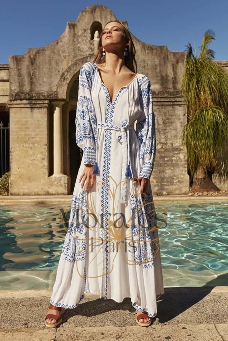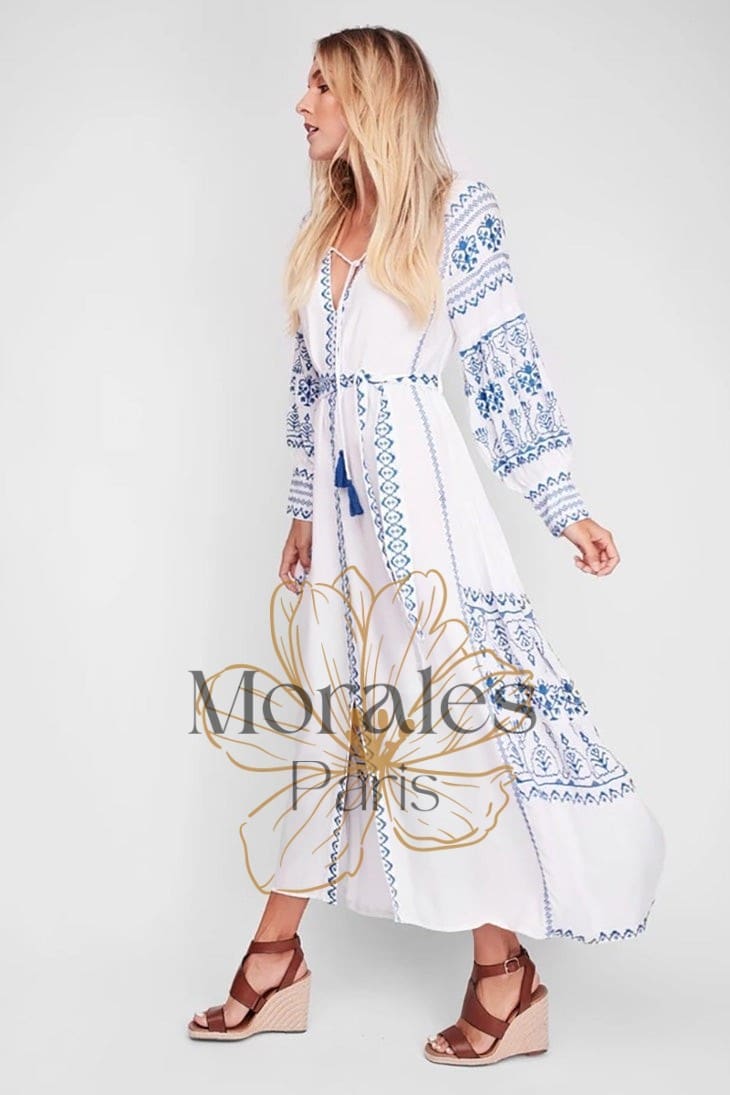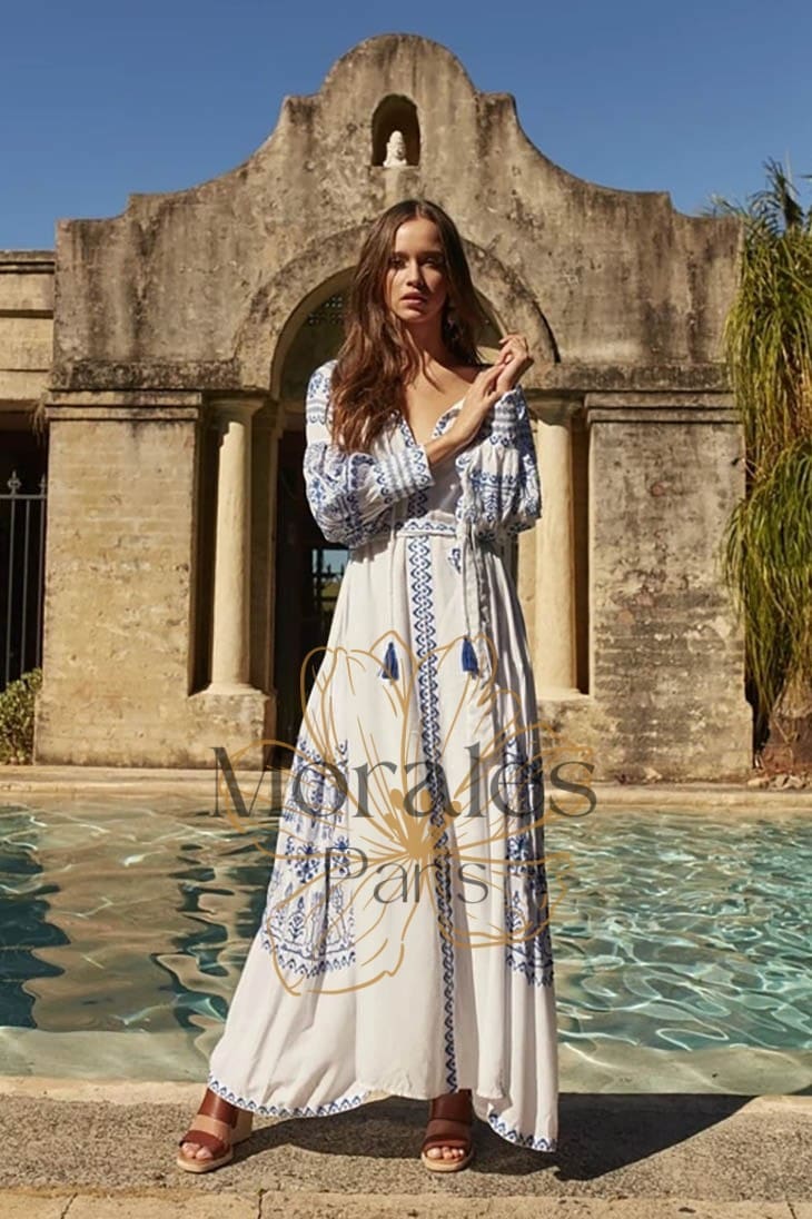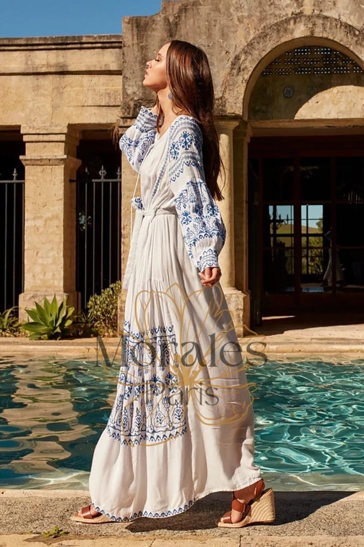 Cette robe en coton doux est ornée de broderies bleues complexes sur un fond blanc. Elle offre des manches longues et une ceinture à la taille pour une allure flatteuse, faisant d’elle le vêtement idéal pour toute occasion estivale.