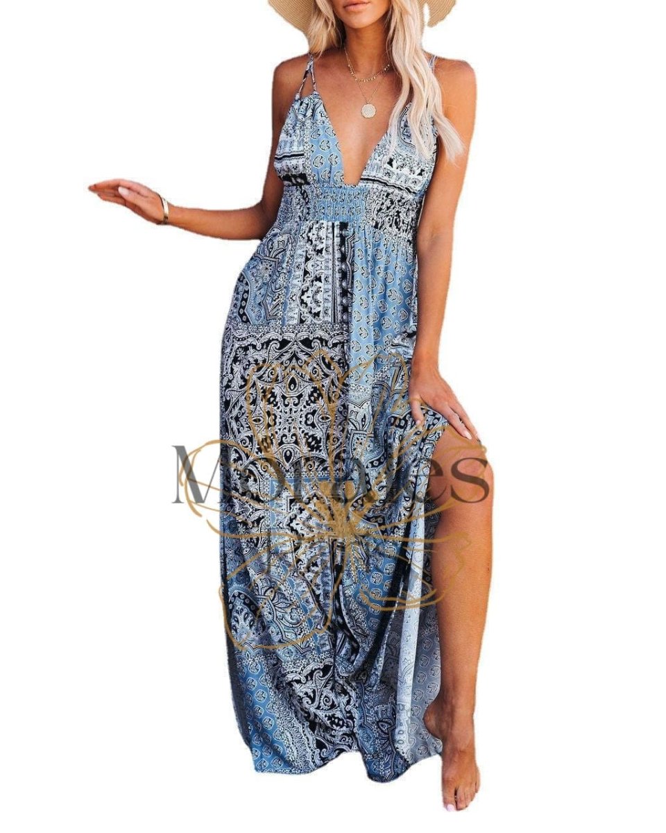 Cette maxi robe boho bleue est l’atout mode idéal pour les femmes qui aiment le style et recherchent le confort. Avec un imprimé de fleurs et de vignes, elle apporte à votre look une allure bohème irrésistible. Grâce à sa coupe ample, vous pourrez bouger à votre aise et les bretelles spaghetti vous permettront de rester fraîche en cas de fortes chaleurs. Que vous soyez à la plage ou en ville, cette robe est la pièce parfaite pour chaque moment !
