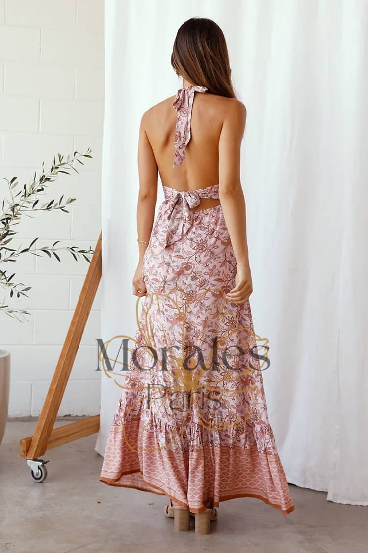 Cette robe bohème-champêtre se distingue par sa taille haute qui sublime votre silhouette et son dos nu qui apporte une touche romantique.