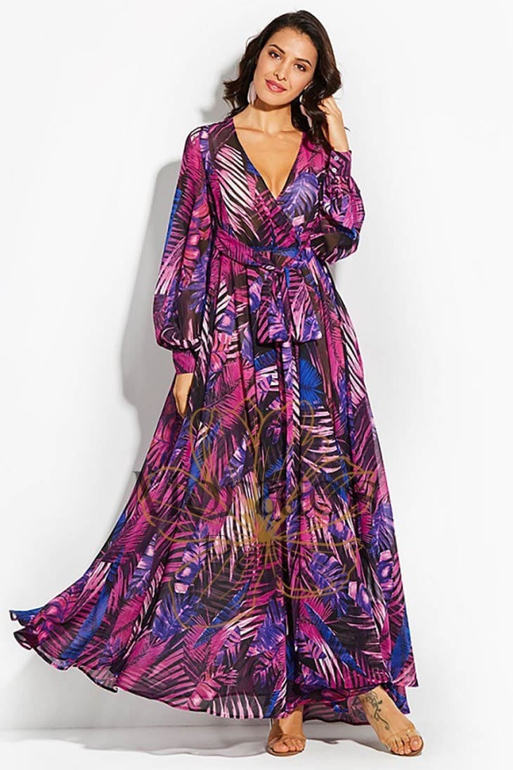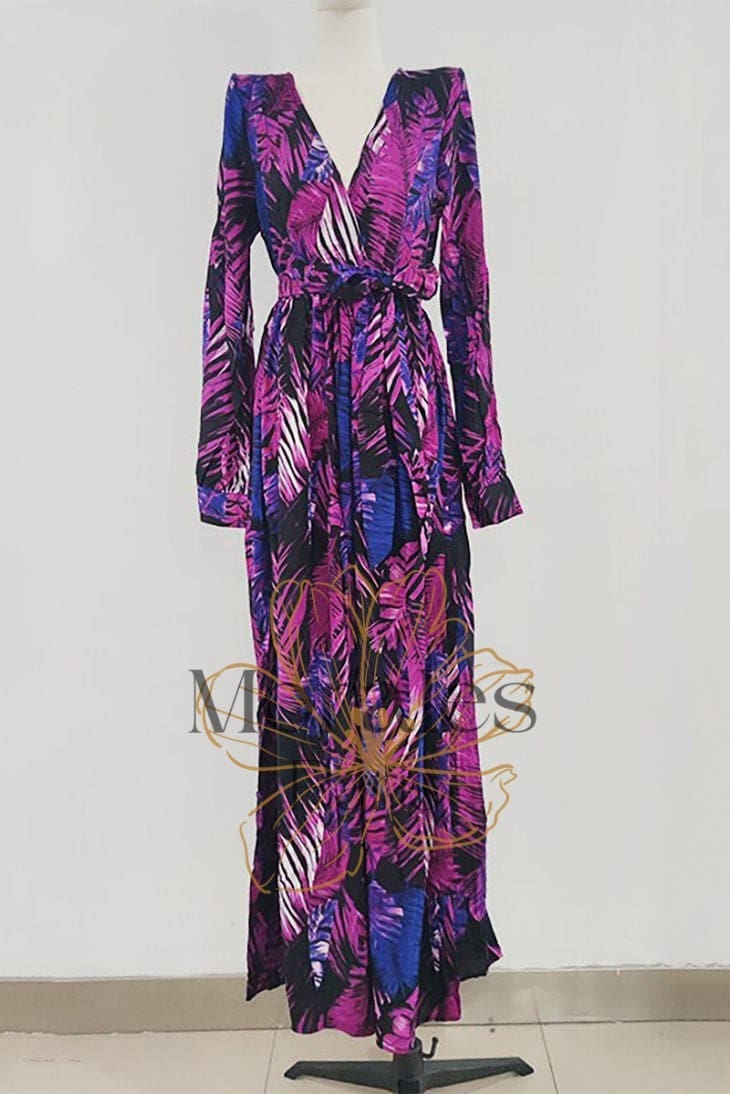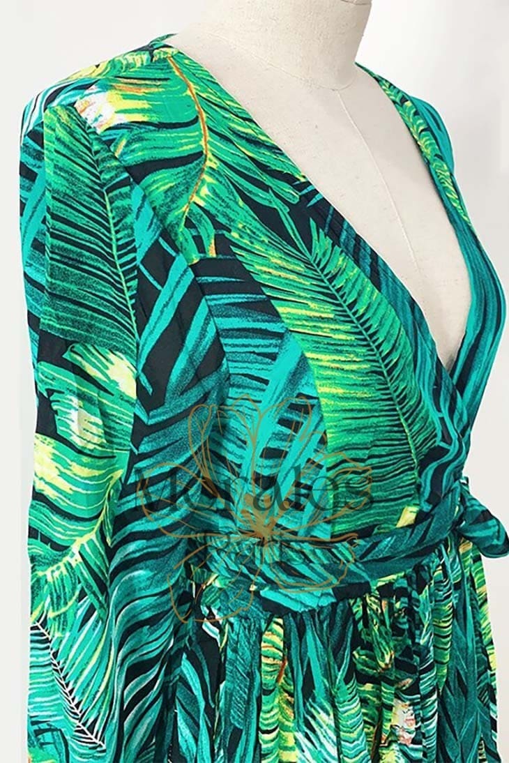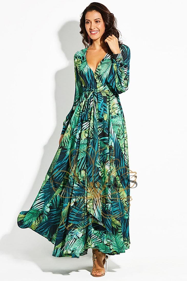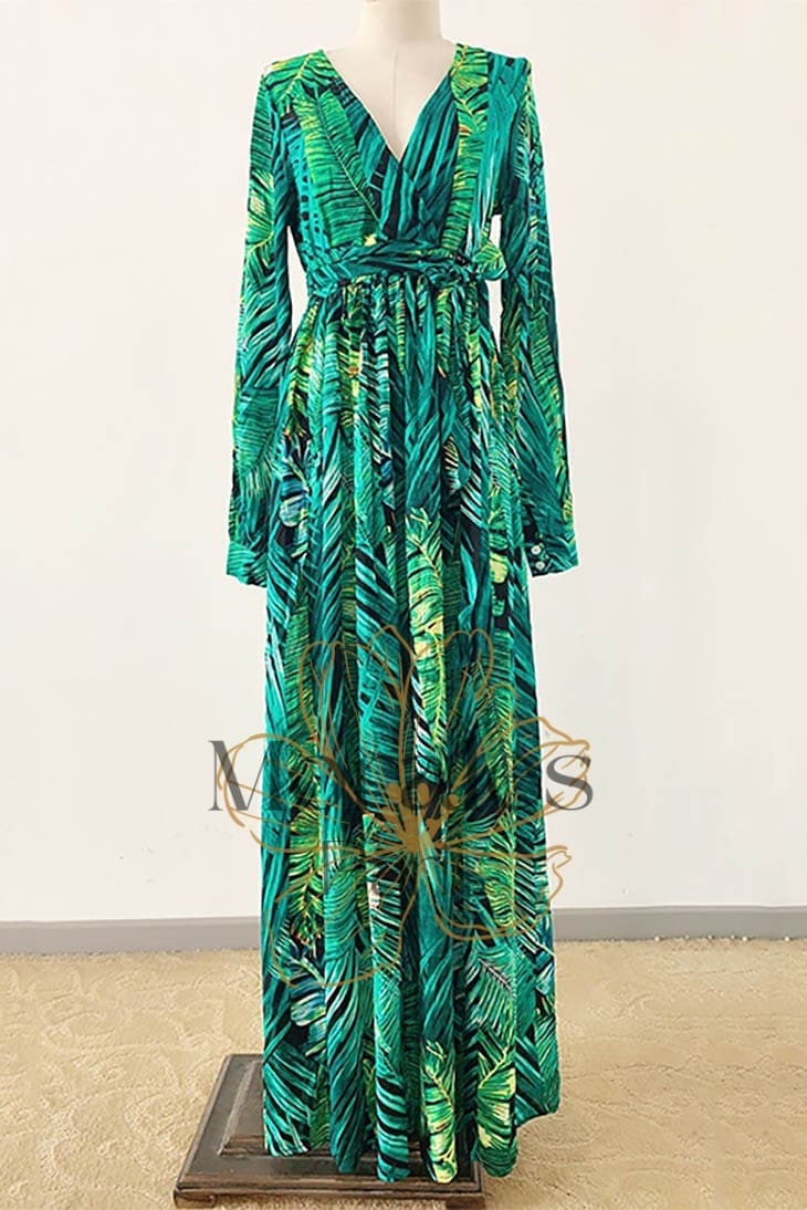 Respirez la liberté avec notre Robe Longue Bohème Exotique. Cette superbe robe est faite en viscose souple et arbore un motif tropical. Elle possède un décolleté en V ainsi que des manches bishop longues. La taille est soulignée par une ceinture assortie, qui crée une silhouette féminine. Qu’il s’agisse d’une fête ou simplement pour le plaisir, cette robe vous fera sentir comme une reine.