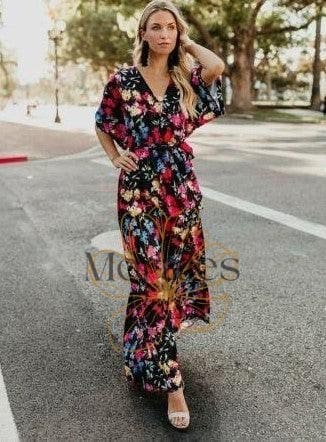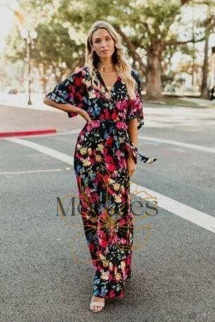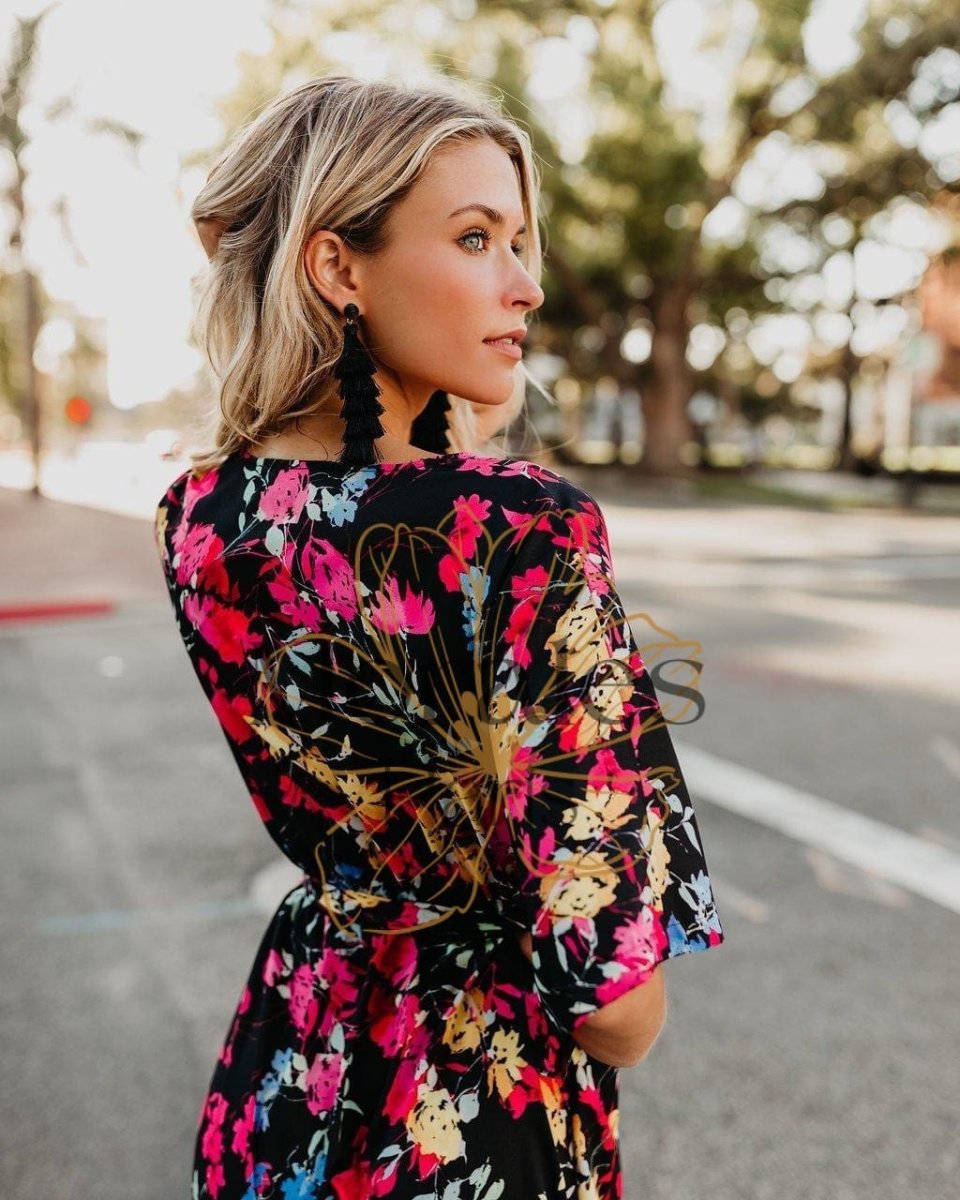 Ce look Bohème Chic unique te séduira ! Craque pour cette Robe Longue au Noir Profond et aux Imprimés Fleuris.