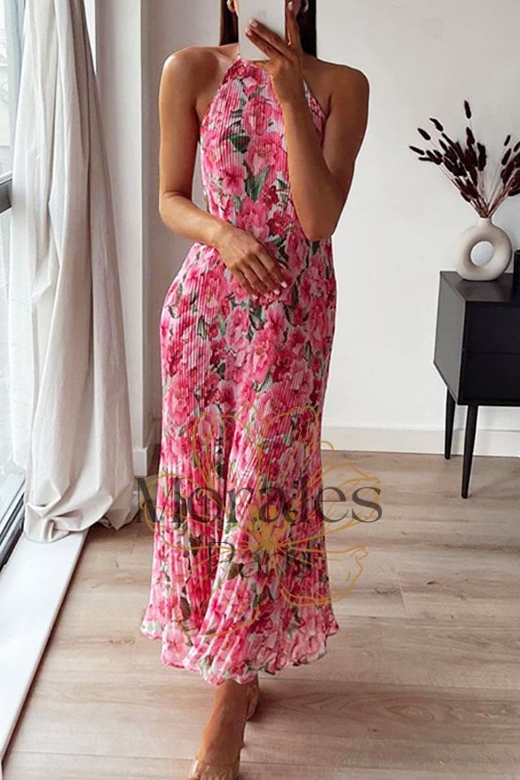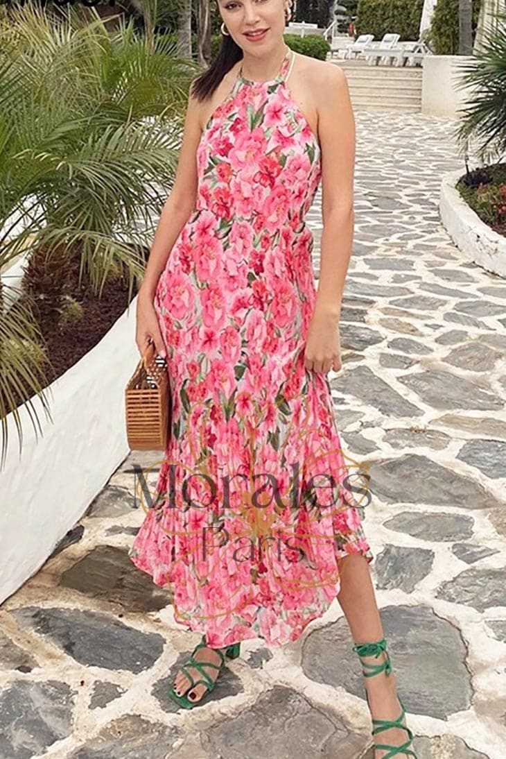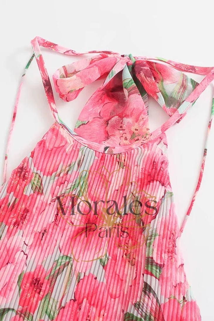 Cette superbe robe présente des motifs complexes de fleurs roses et de feuilles vertes, ainsi qu’un magnifique dos nu. Son style sans manches est à la fois chic et flatteur, et vous ne manquerez pas de capter l’attention de tous lorsque vous la porterez.