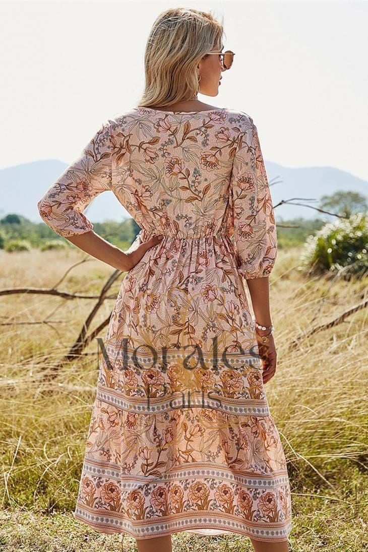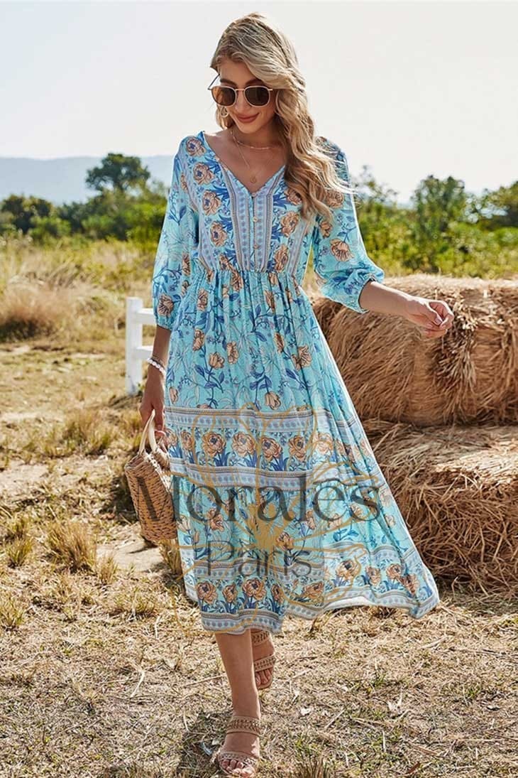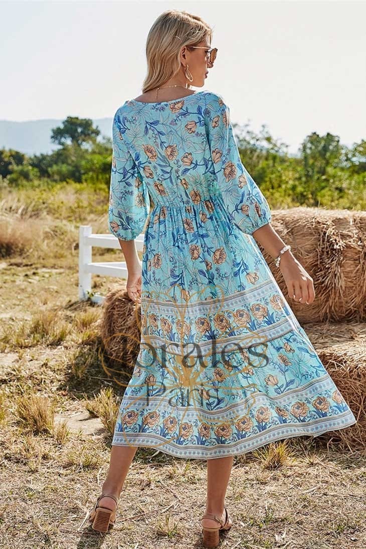 Cette merveilleuse robe est parfaite pour une balade au marché fermier ou un pique-nique romantique dans le parc. La taille ajustée et la coupe fluide de la robe s’adaptent à toutes les silhouettes, tandis que les manches 3/4 offrent juste ce qu’il faut de couverture.