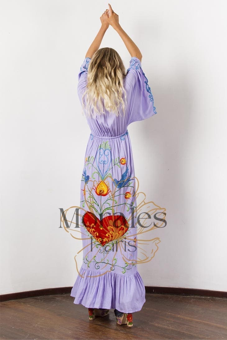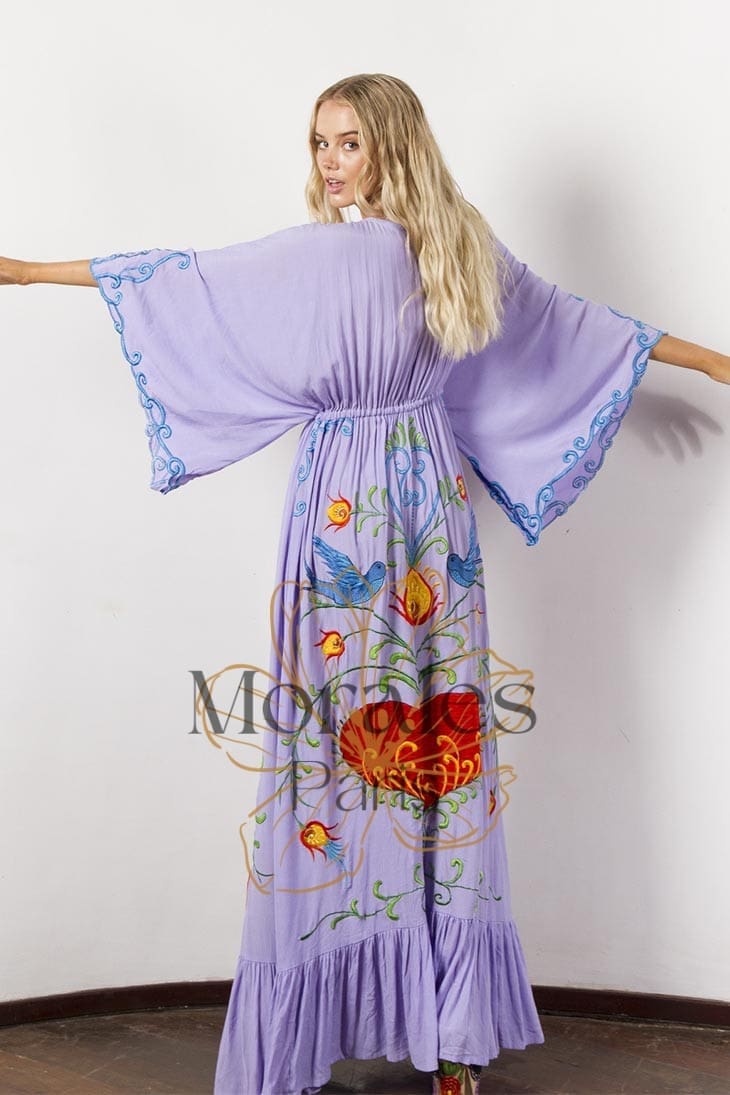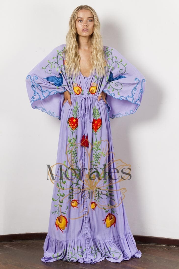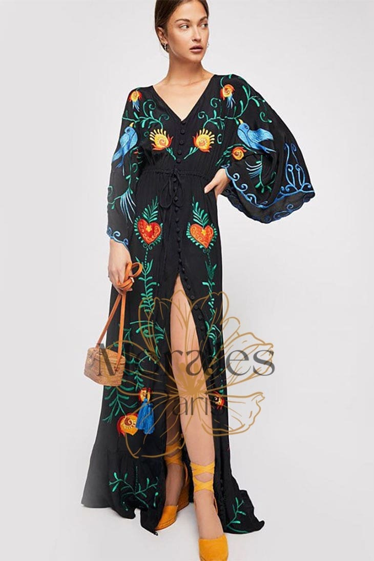 Cette splendide robe présente une encolure en V, des motifs hippies brodés et des manches longues et évasées. La coupe large de la robe flatte votre silhouette et la rend incroyablement souple à porter. Que vous erriez sur un marché ou que vous dansiez à un festival de musique, cette robe vous permettra de vous sentir à votre meilleur.