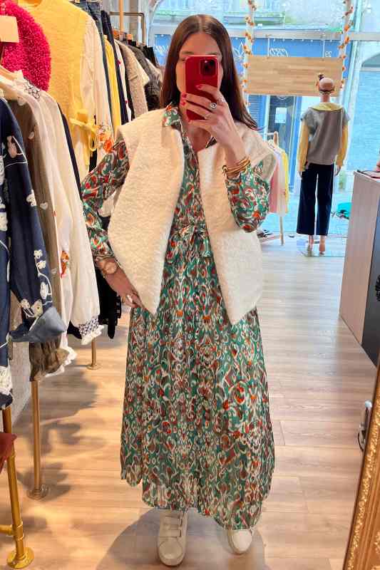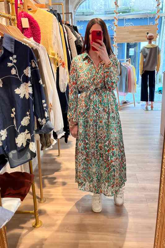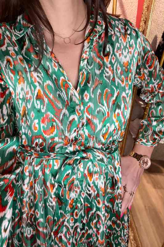ette robe longue, confectionnée à 100 % en polyester, allie confort et élégance. Elle se ferme facilement avec des boutons sur le devant, permettant un ajustement pratique et moderne. La ceinture assortie marque la taille et souligne la silhouette de manière flatteuse. Le motif vibrant de vert, orange et blanc apporte une touche dynamique et fraîche, tandis que le col en V ajoute une note de sophistication. Les manches longues ajoutent du style tout en restant confortables. Parfaite pour une occasion spéciale ou un look estival, cette robe est une pièce à la fois chic et légère.
