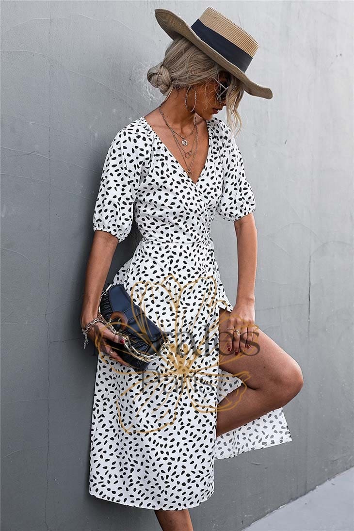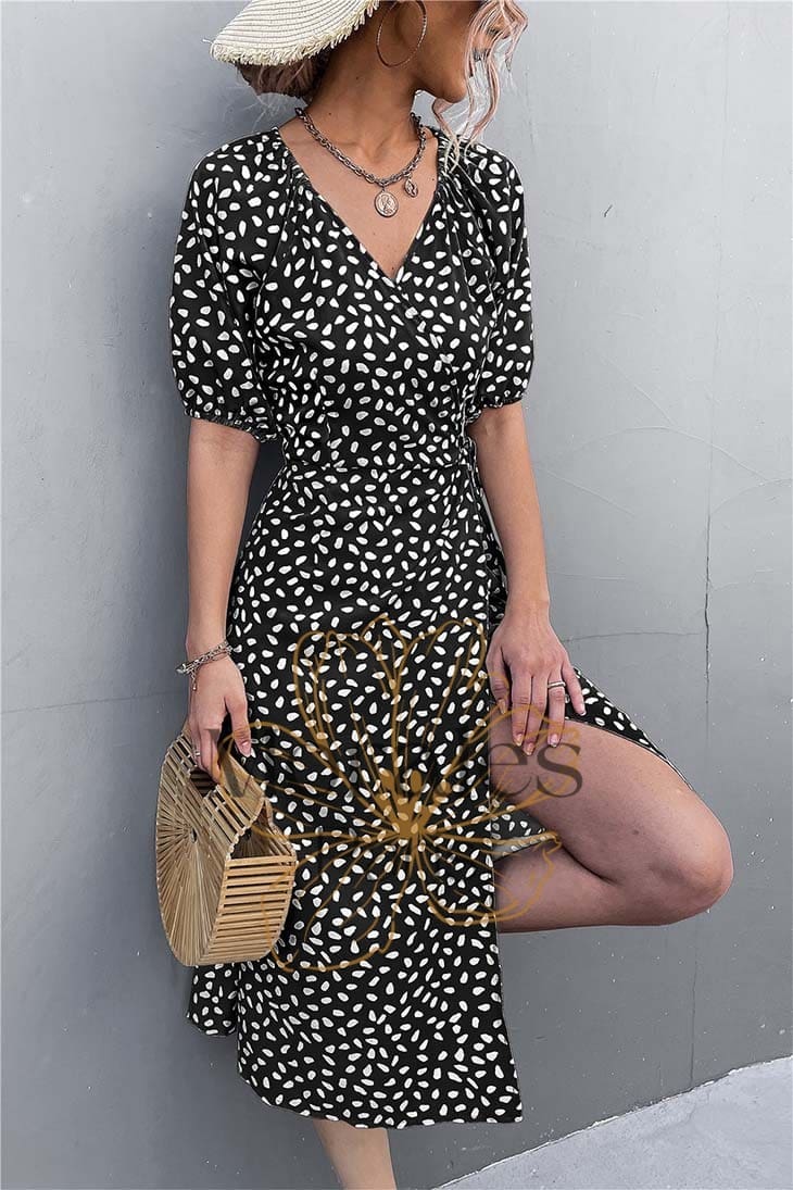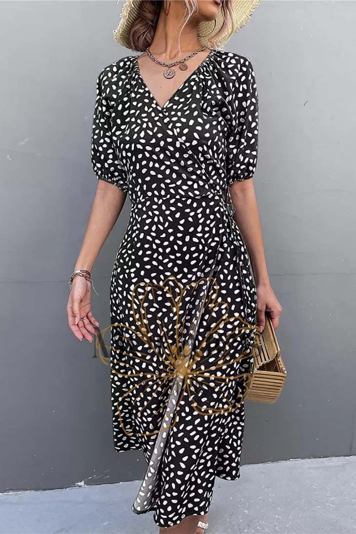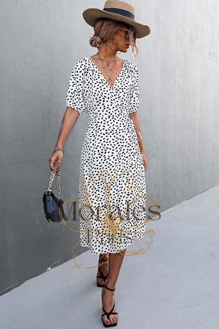 Cette Robe Longue Bohème est idéale pour des vacances estivales ! Le tissu en mousseline aéré et l’imprimé floral à pois mettront votre silhouette en valeur, tandis que les manches mi-longues et le col en V offrent un look flatteur. La jupe de style portefeuille est à la fois élégante et confortable, faisant de cette robe un must-have dans votre garde-robe.