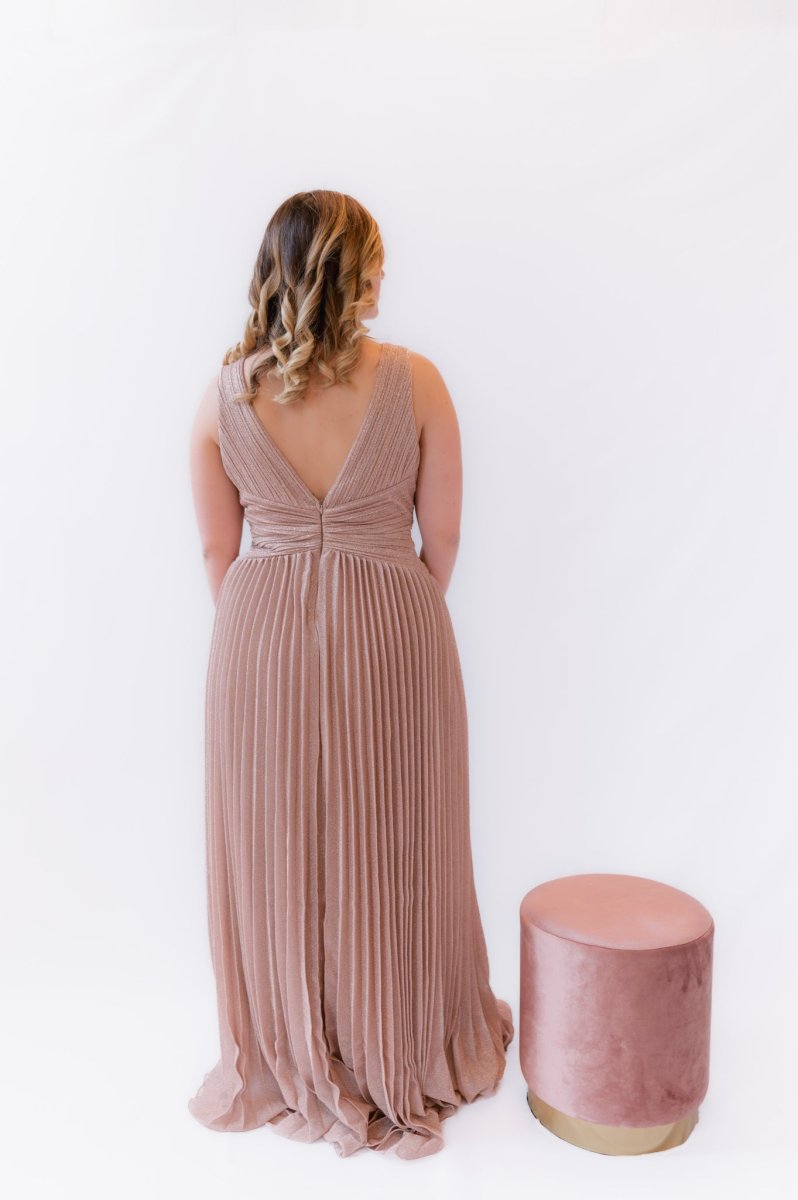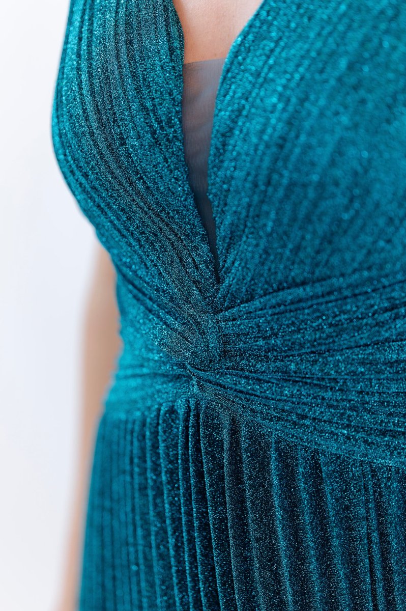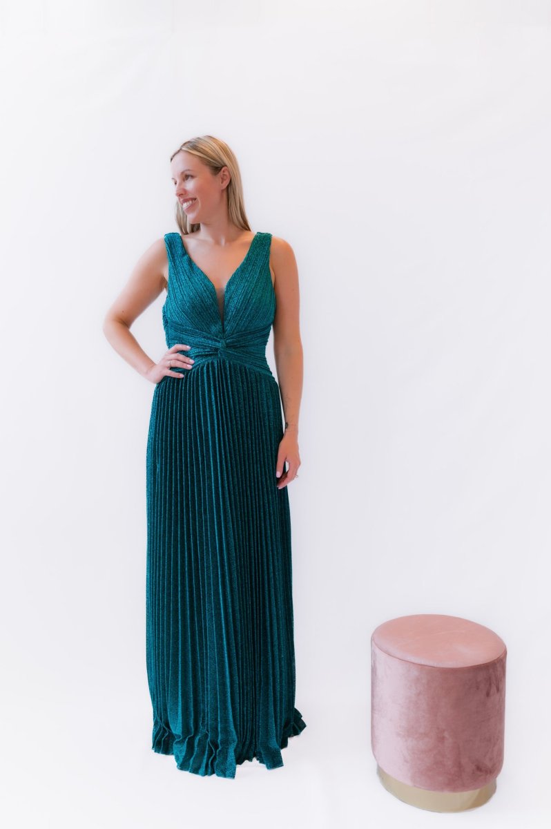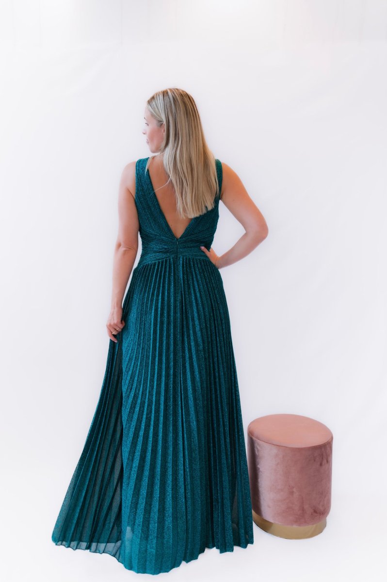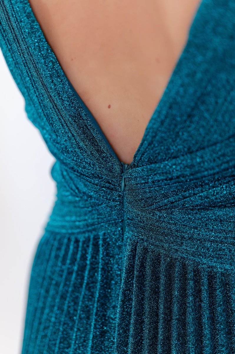 Robe longue à paillettes Plissée sur toute la longueur dans le bas Drapée sur le dessus Dos en V Col en V Cintrée Composition : 100% polyester Conseils d’entretien : lavage à la main, pas de séchage en tambour, repassage à froid