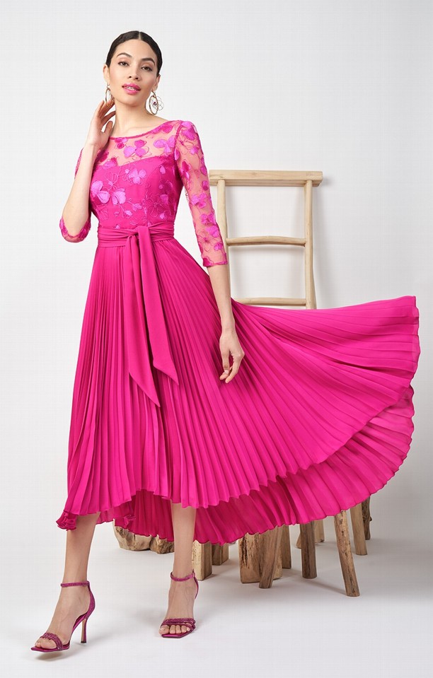 Robe longue Haut en dentelle Manches 3/4 Col rond Dos semi-ouvert Cintrée Jupe plissée plus courte devant que derrière Ceinture en voile Composition : 83% polyester, 17% polyamide Conseils d’entretien : nettoyage à la main, pas de séchage en tambour, pas de repassage