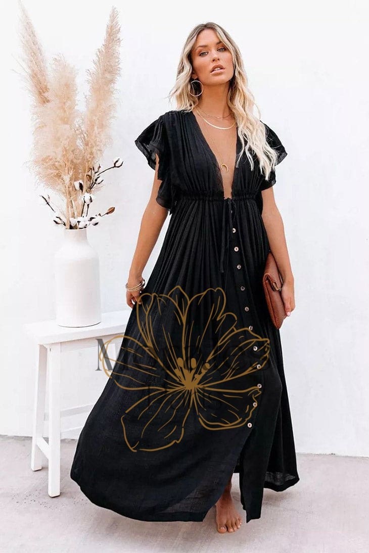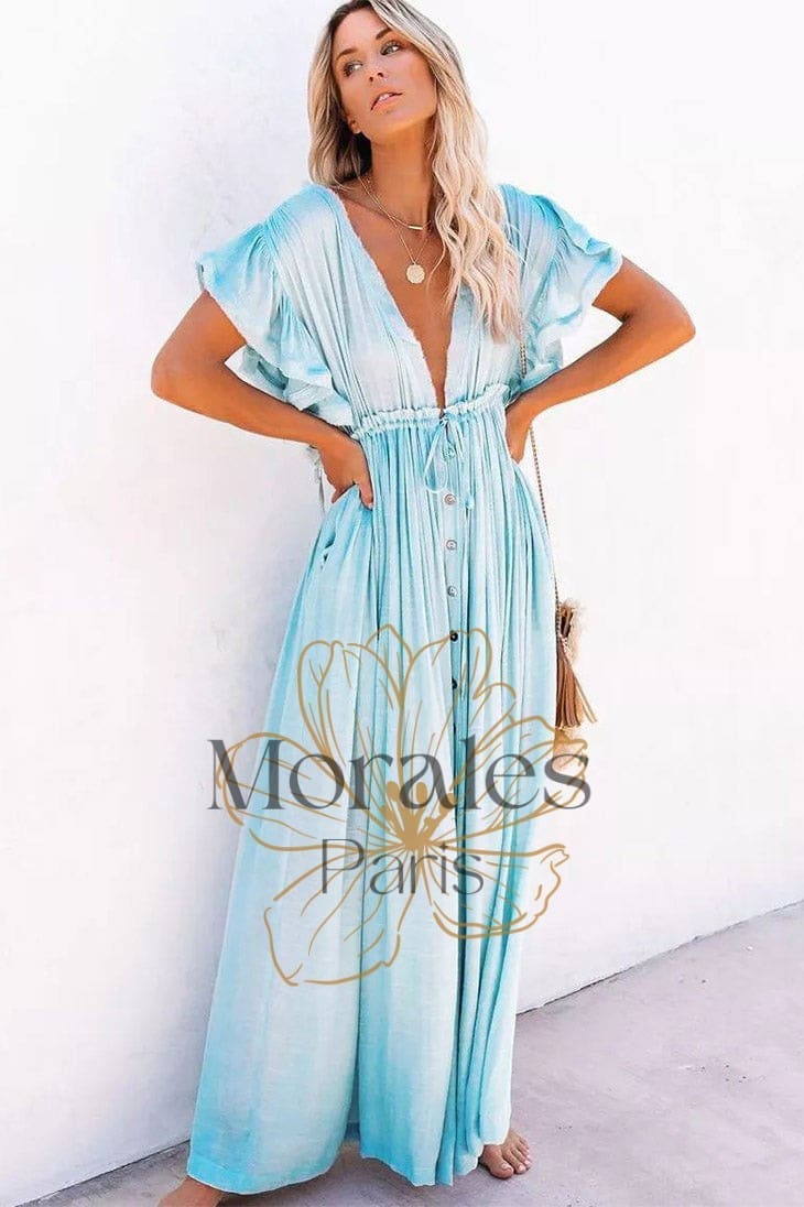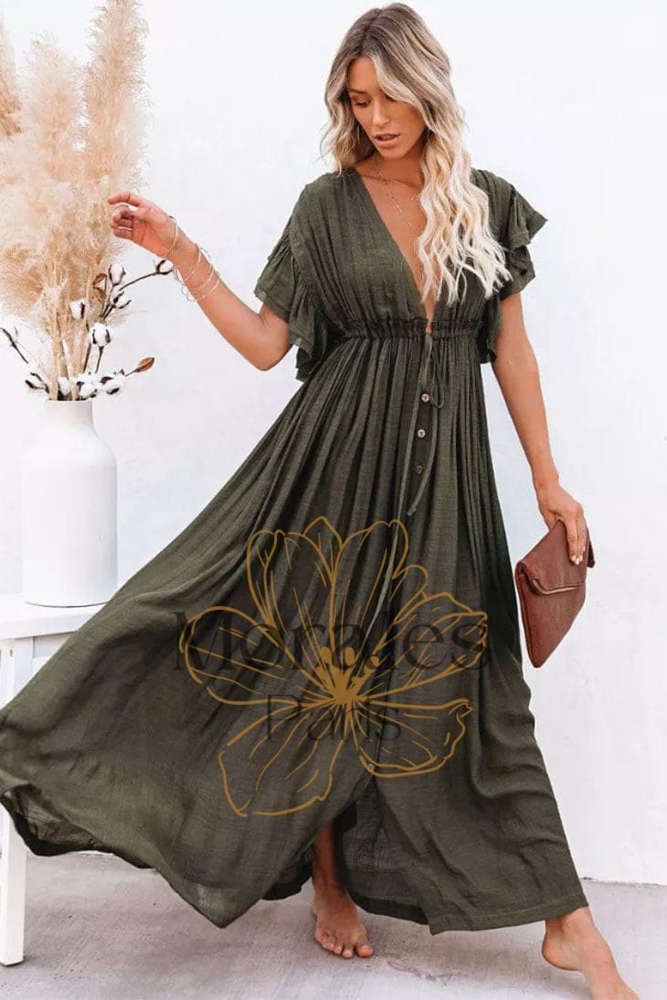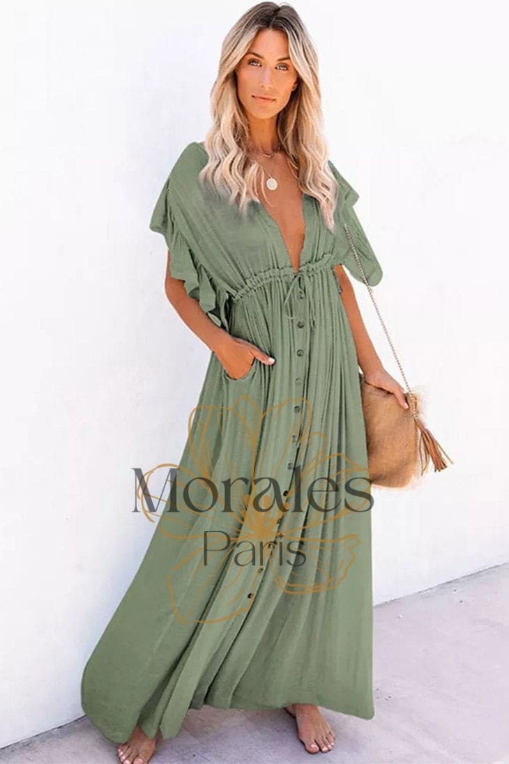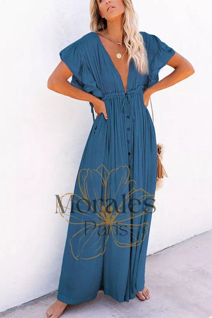 Créée avec un tissu léger et aéré, elle affiche un décolleté plongeant, des manches courtes à volants et une fente sur la jupe. Le corsage est orné de jolis boutons, pour ajouter une touche féminine.