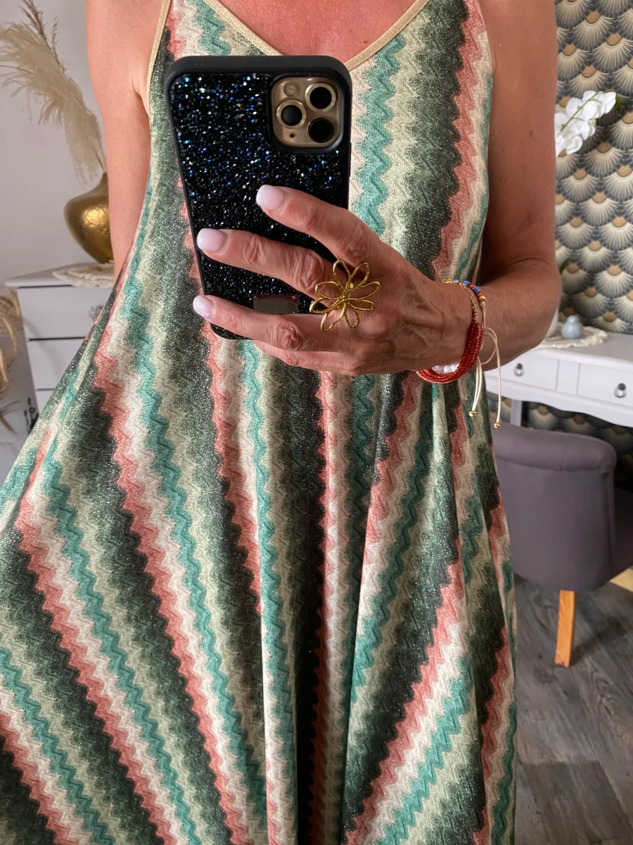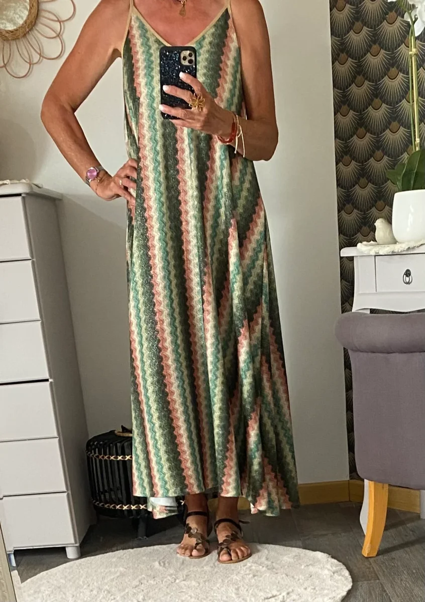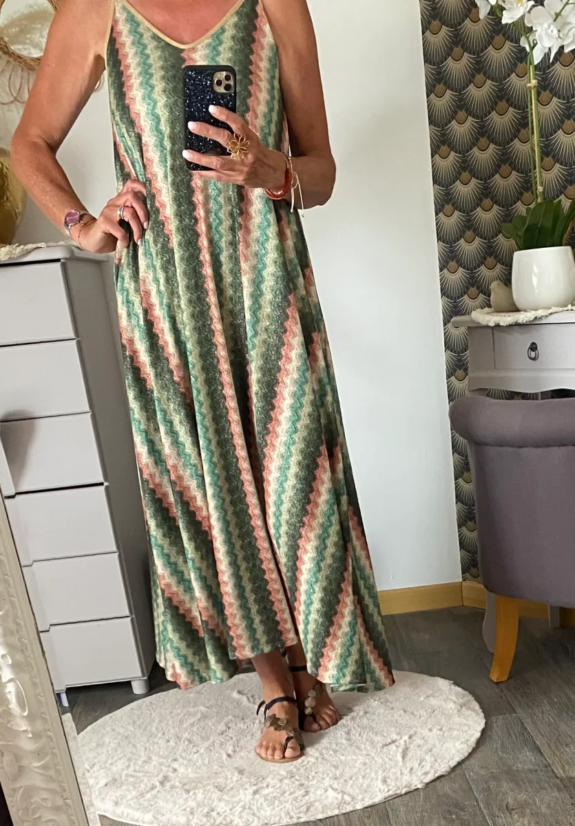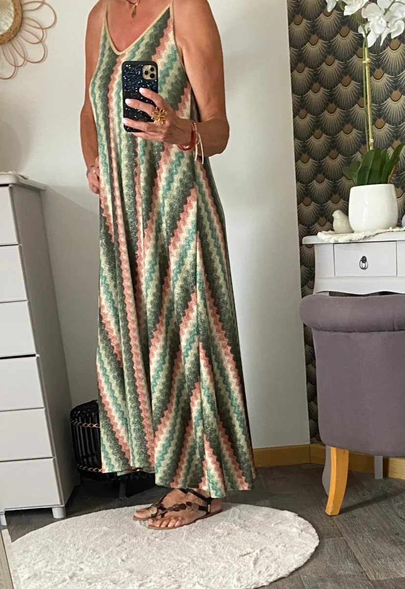 Robe longue, à bretelles fines, col v devant et derrière , en lurex , très douce sur la peau et fluide.